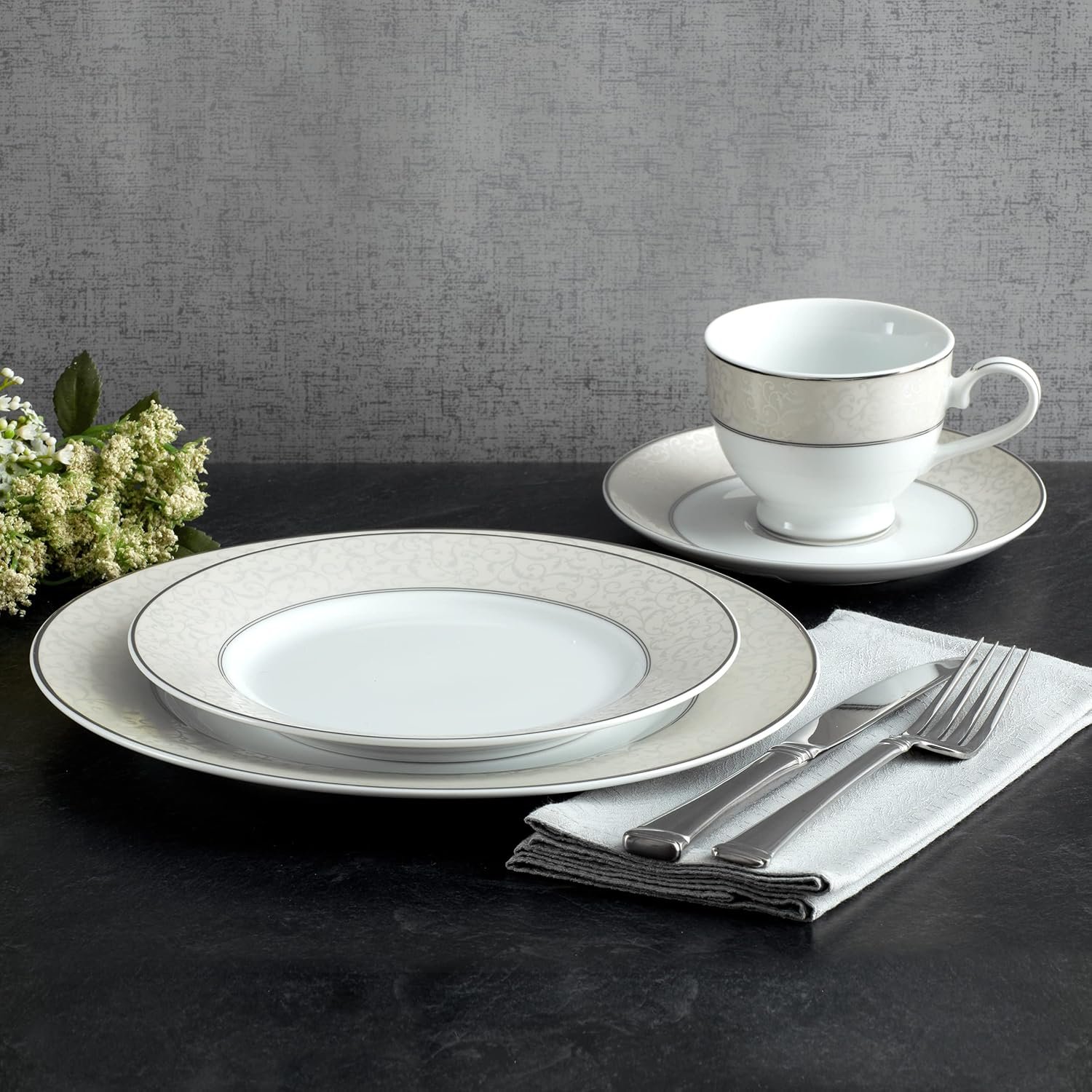 VERSATILE DESIGN: the beautifully detailed design complements any decor and can be used for formal and casual occasions. Each piece is chic and elegant, accented by inner and outer borders of Platinum.
