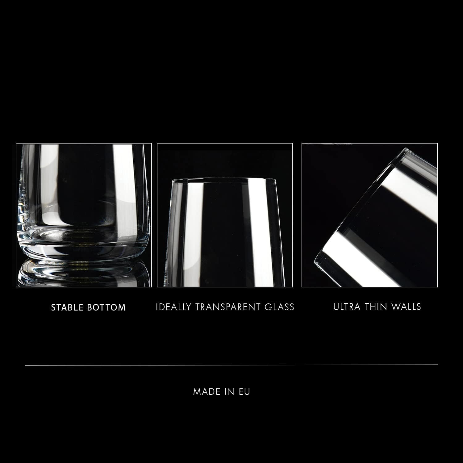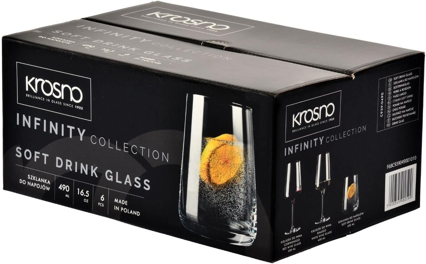 SET OF 6 GLASSES – Made of perfectly clear glass, the glasses are 4.8 inches (122 mm) high and 3.62 inches (92 mm) in diameter and have a capacity of 16.6 oz (490 ml). Wonderfully reflecting light reflections, they make any contents look good.