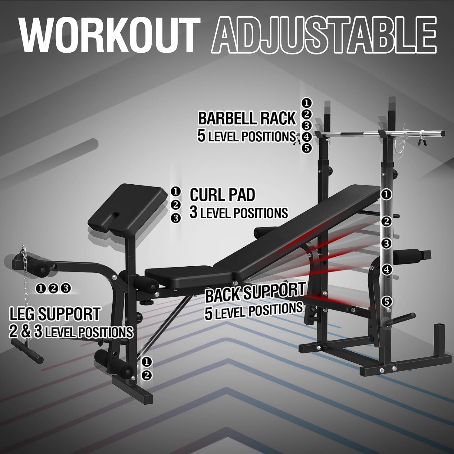[Multi-Function Olympic Weight Bench] OB01 base unit is a true game-changer, condensing an entire commercial gym into a single weight bench. It offers an adjustable leg developer, adjustable barbell rack, FID weight bench, adjustable preacher curl pad, chest fly machine, and lat pulldown machine, making it a true all-round for your home gym