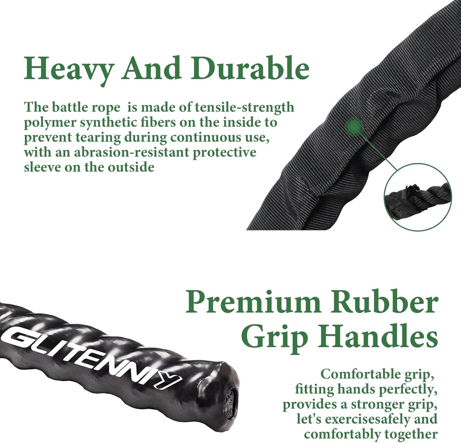 Exercise Rope with NON-SLIP Design Handle: The handle is designed to protect your hands with an added non-slip design that provides a firm grip when you are using the battle rope