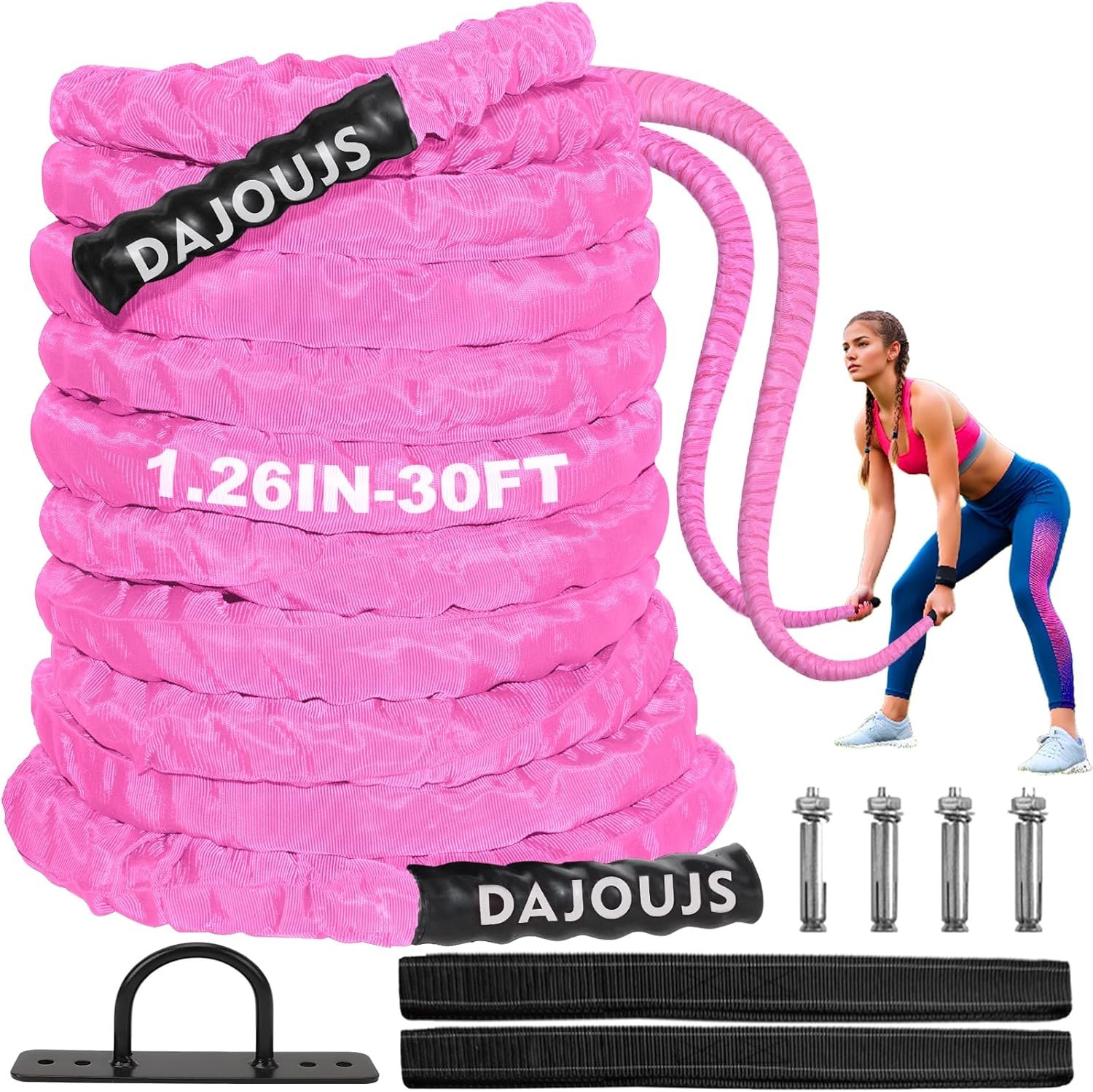 Ultra-durable Structured Battle Rope: The battle ropes are made of 3 strands of 100% polyester fiber, High tensile strength exercise rope which is strong in tensile strength and resistant to loosening and deformation, an extra protective cover is added to the outer layer, ensures a durable battle rope even on concrete. The DAJOUJS battle rope is an ideal choice for beginners and serious fitness enthusiasts as a battle ropes for home gym and outdoor exercise