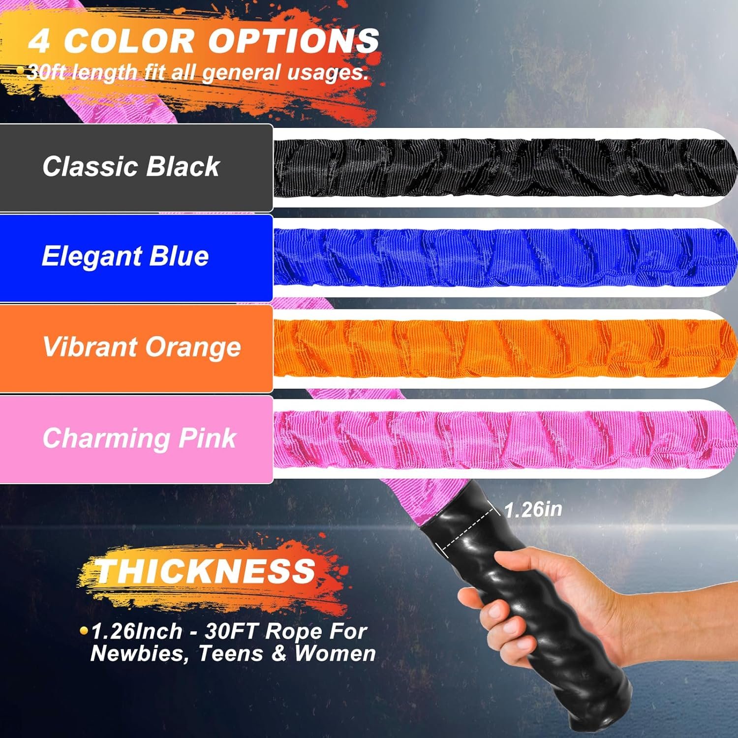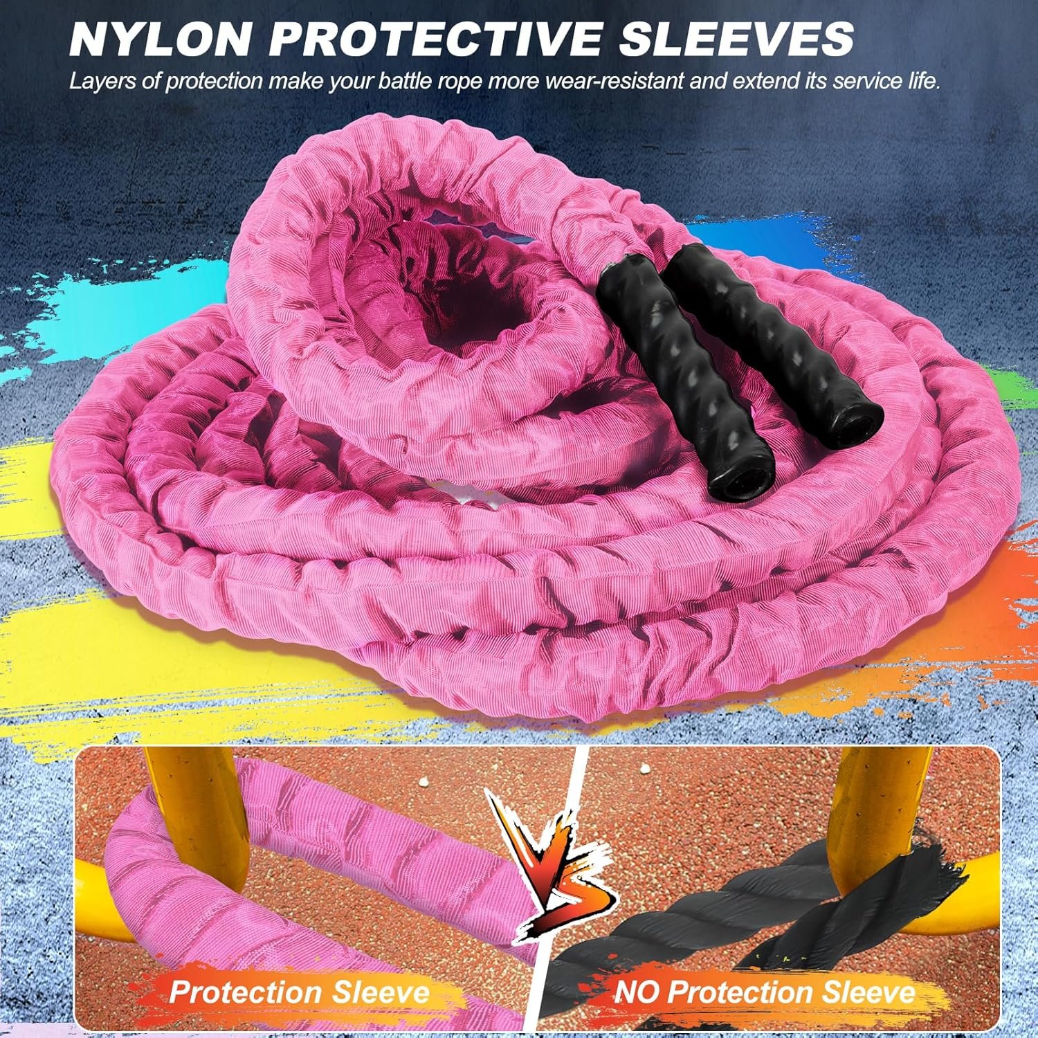 Multicolor and Multisize Battle Ropes to Choose From: We offer black, pink, blue and orange battle ropes with a thickness of 1.26 / 1.5 inches and a length of 30ft length. Our battle ropes are suitable for all levels and can be used for different training purposes. The 1.26″-30FT battle rope weighs 9.5 pounds, which is suitable for beginners to conduct daily exercises at home, the 1.5″-30FT battle rope weighs 13.5 pounds and is suitable for intermediate – to – advanced professional fitness enthusiasts