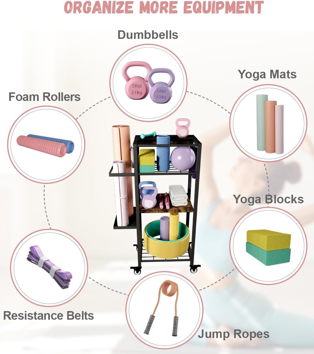 Ardier gym organizers can accommodate yoga mats, foam rollers, resistance bands, dumbbells, yoga blocks, jump ropes and other workout equipment. Keep your home fitness equipment organized and easily accessible with this gym organizer. Say goodbye to clutter and welcome a more efficient exercise space to make your exercise more convenient.