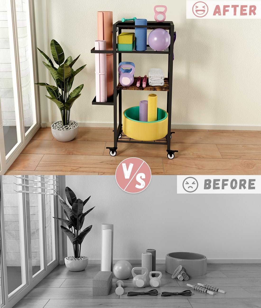 Convenient Mobility: The rolling with 4 flexible casters is designed to be easy to move around and freedom to rotate 360 degrees. You can push the gym organizer outdoors to practice and then quickly move it back indoors for storage. This weight storage racks for sports is fantastic for garages, homes, gyms, yoga room, pilates room and more.