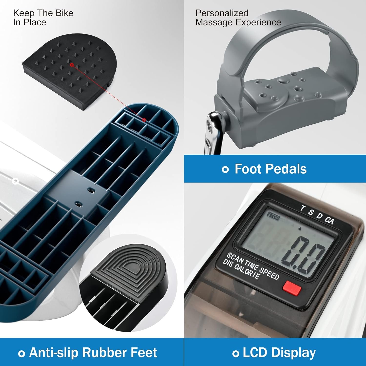 ▲Carpet Special Anti-Kid Pad:▼ The normal 4pcs wave shape pad enhanced the frictional force between bike and floor, which brings steady using. Don’t worry, these nail point pads and normal pads are made in soft rubber and will not hurt your carpet or floor. Which makes the mini exercise bike more stable whether on the carpet or on the ground.