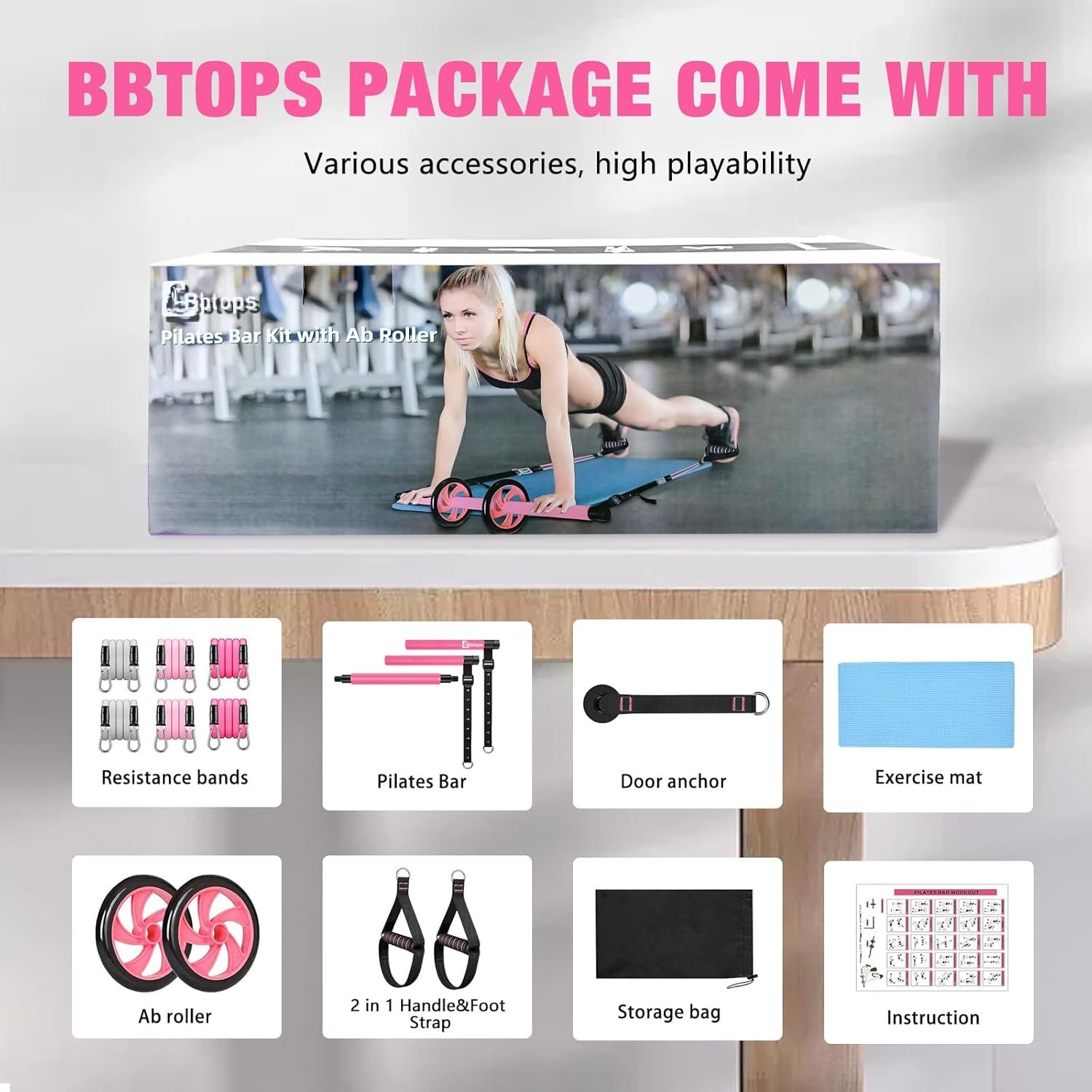 【BBTOPS Perfect Pilates Bar Set】Our portable pilates bar kit includes 3 sections of high quality steel pipes, 6 resistance bands, 2 abdominal wheels, 2 handles, 1 door anchor, 1 portable bag, 1 training guide, 1 Mat, If you have any questions about quality or use method, please contact us promptly and we will get back to you within 24 hours.