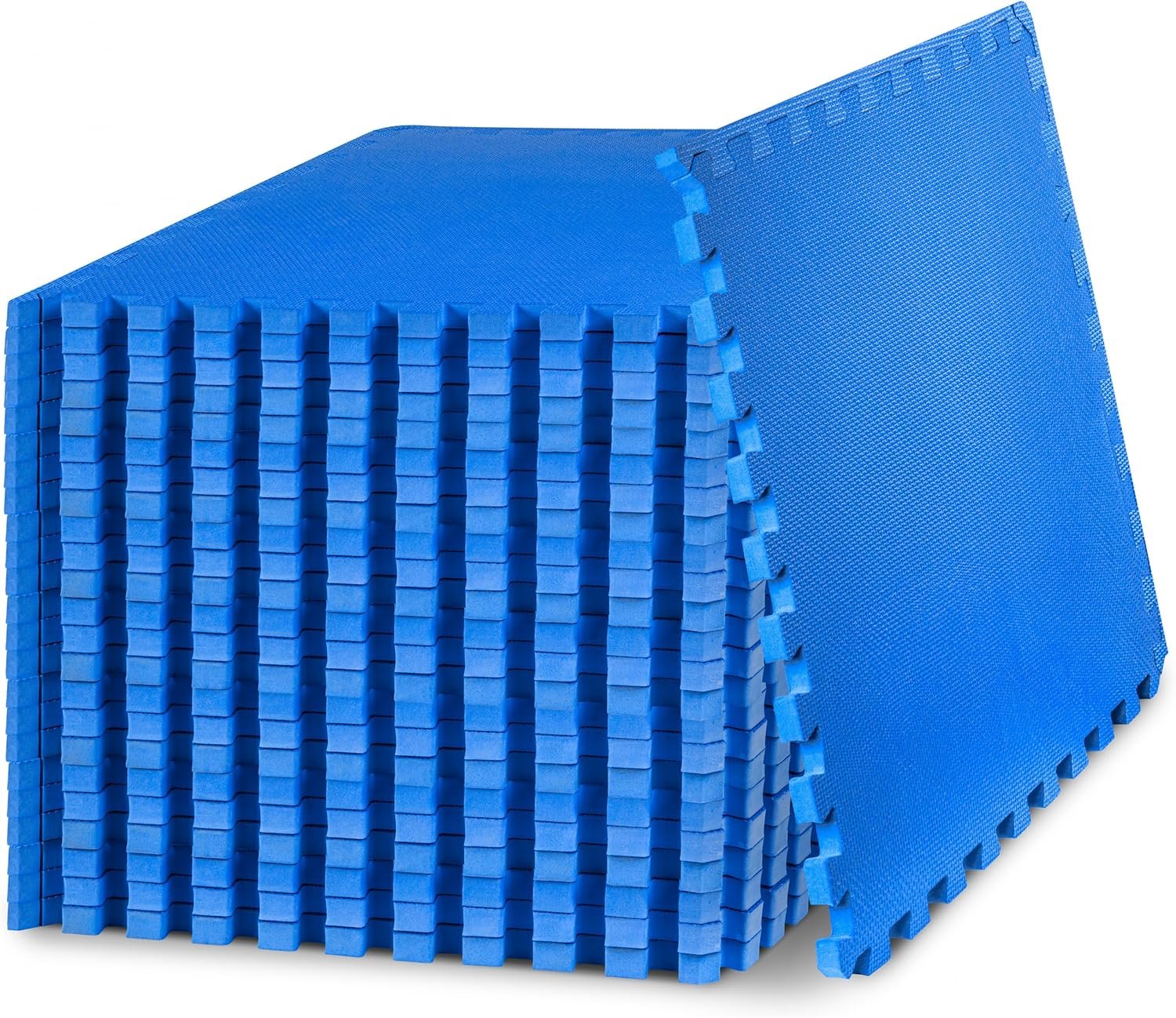 Transform any space into a comfortable workout area with the ProsourceFit Exercise Puzzle Mat 3/4″ or ProsourceFit Exercise Puzzle Mat 1″. Six extra-thick tiles create protective flooring over wood, concrete, or carpet for workouts and gym equipment. This is the perfect solution for anyone looking for an exercise mat or multipurpose flooring thicker than 1/2″ thick. Both mats have great durability, but the 1″ creates more protection for heavier gym equipment and higher traffic. The textured surface has a soft feel with non-skid traction that is low maintenance. Interlocking pieces are easy to assemble, covering 96 square feet. 12 border pieces help to create a flawless finish. Built to absorb impact and provide cushion to sensitive joints while reducing noise. EVA foam contains no toxic phthalates. Use just a few tiles for smaller spaces, or purchase multiple sets for large areas. Perfect for fitness studios, home gyms, commercial use, children’s play areas, gymnastics or wrestling practice, yoga and more!