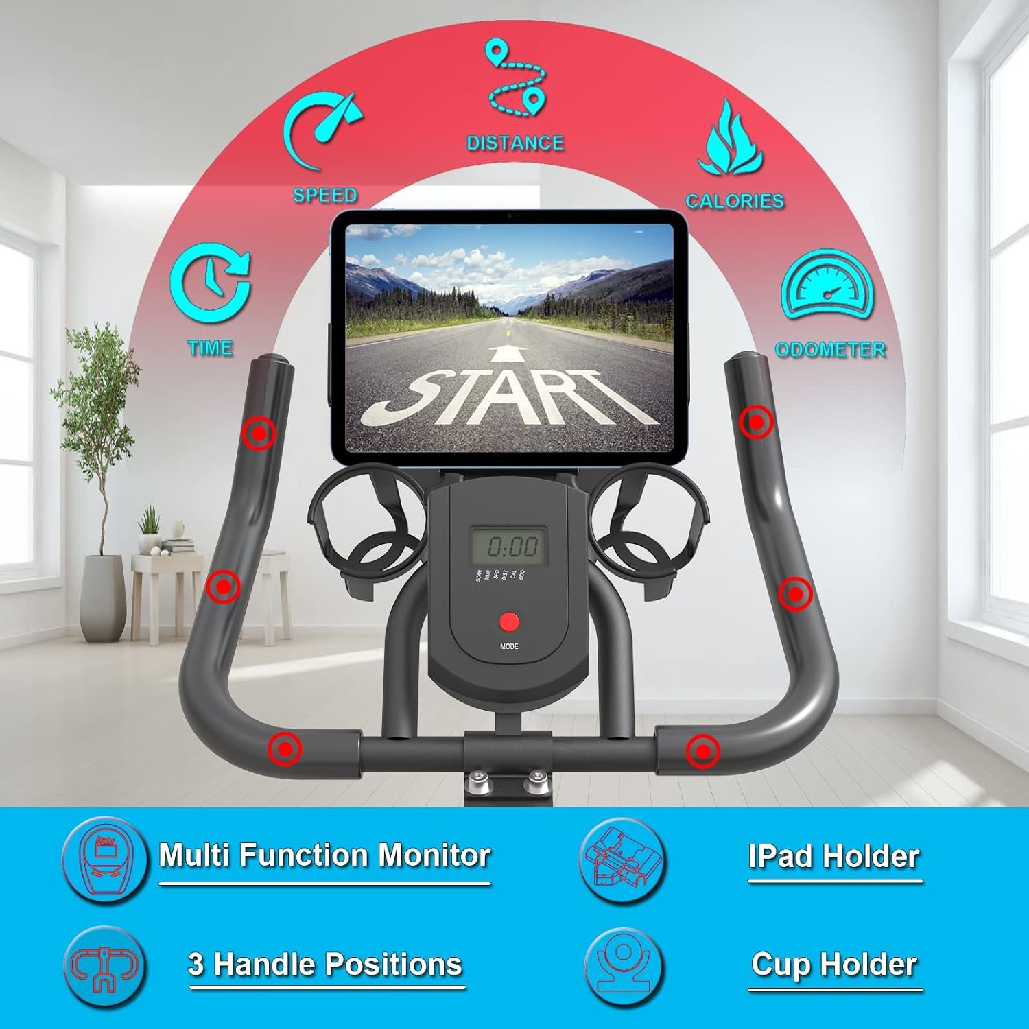 🚴【LCD MONITOR & PAD MOUNT】The exercise bike is equipped with a multi-function LCD monitor that displays time, speed, distance, calories burned, mile(NOT km), allowing you to easily get all the training data. And equipped with a phone/PAD bracket. You can watch videos or programs during training, enjoy sports and music, which can make the exercise more easily.
