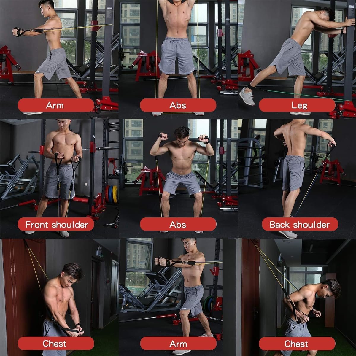 DIFFERENT COLOR ADJUSTABLE RESISTANCE BANDS: The exercise bands come with 5 different resistance level 10lbs, 20lbs, 30lbs, 40lbs and 50lbs in 5 different colors, and and can be used alone stacked in any combination to a maximum equivalent of 150 lbs