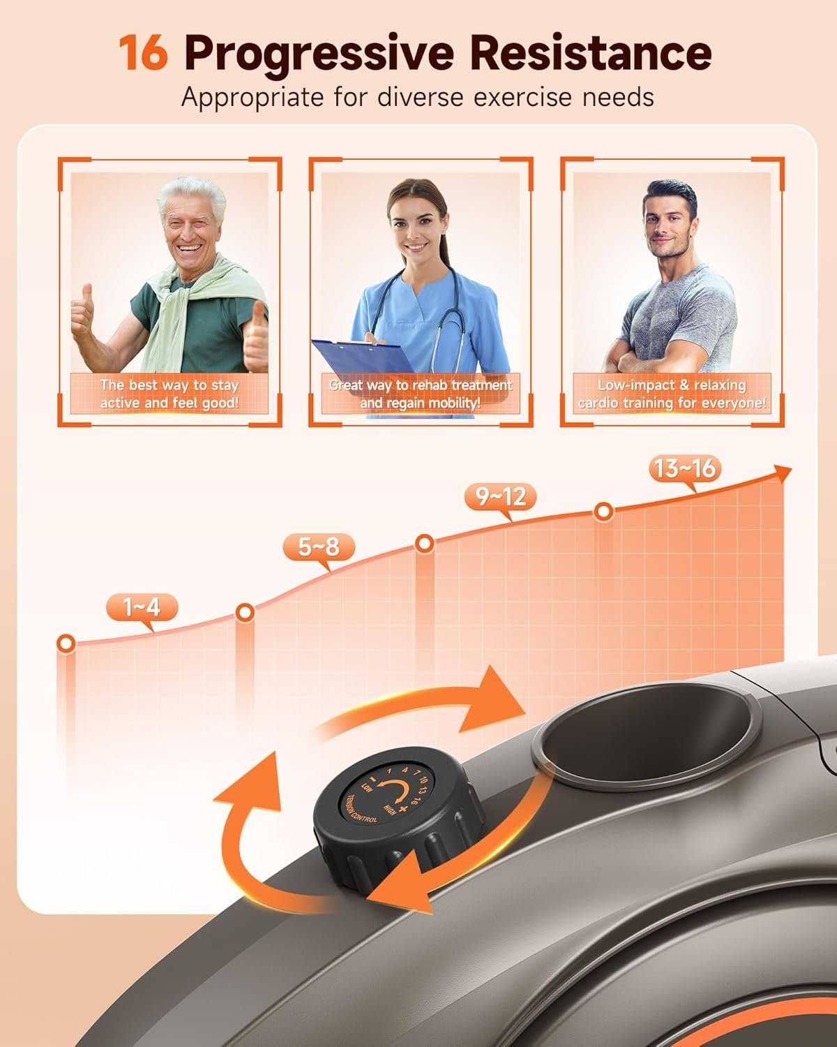 16-Level Progressive Resistance: Niceday Recumbent Bike offers 16 levels of progressive resistance, suitable for the diverse exercise needs of the whole family; The mechanical knob allows precise control of resistance changes, ensuring seamless transitions between intensity levels; Ideal for gentle physical therapy and relaxing cardio exercise