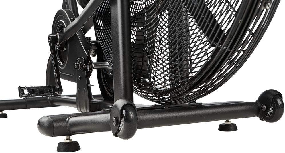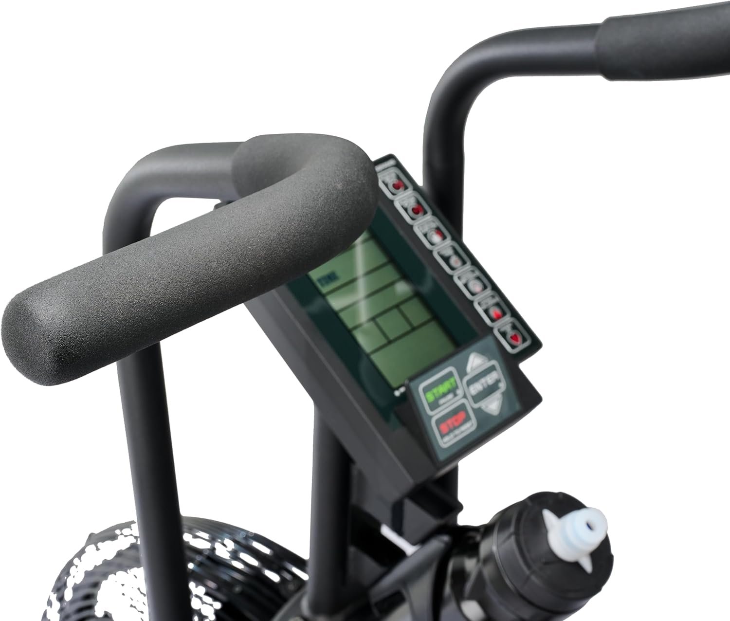 The all NEW Assault Air Bike is a modernly designed take on a very old traditional air resistance bike. Fixing everything that was wrong and implementing new technology. Strengthening all pivot points and upgrading them with bearings instead of bushings to provide a powerfully smooth operation. Work out with no limits due to the unlimited resistance provided by air. Power your legs and arms faster or slower to determine your resistance. Monitor time, distance, calories, watts, RPMs, speed with the on board smart computer console. Includes Motivating programs, like Tabata Intervals, which help build up strength and stamina or choose the Heart Rate monitoring program to monitor your pulse and build up your aerobic base. All this is wrapped up in a frame that can take the abuse and dish it out too. Transport Handle and water bottle holder with water bottle included.