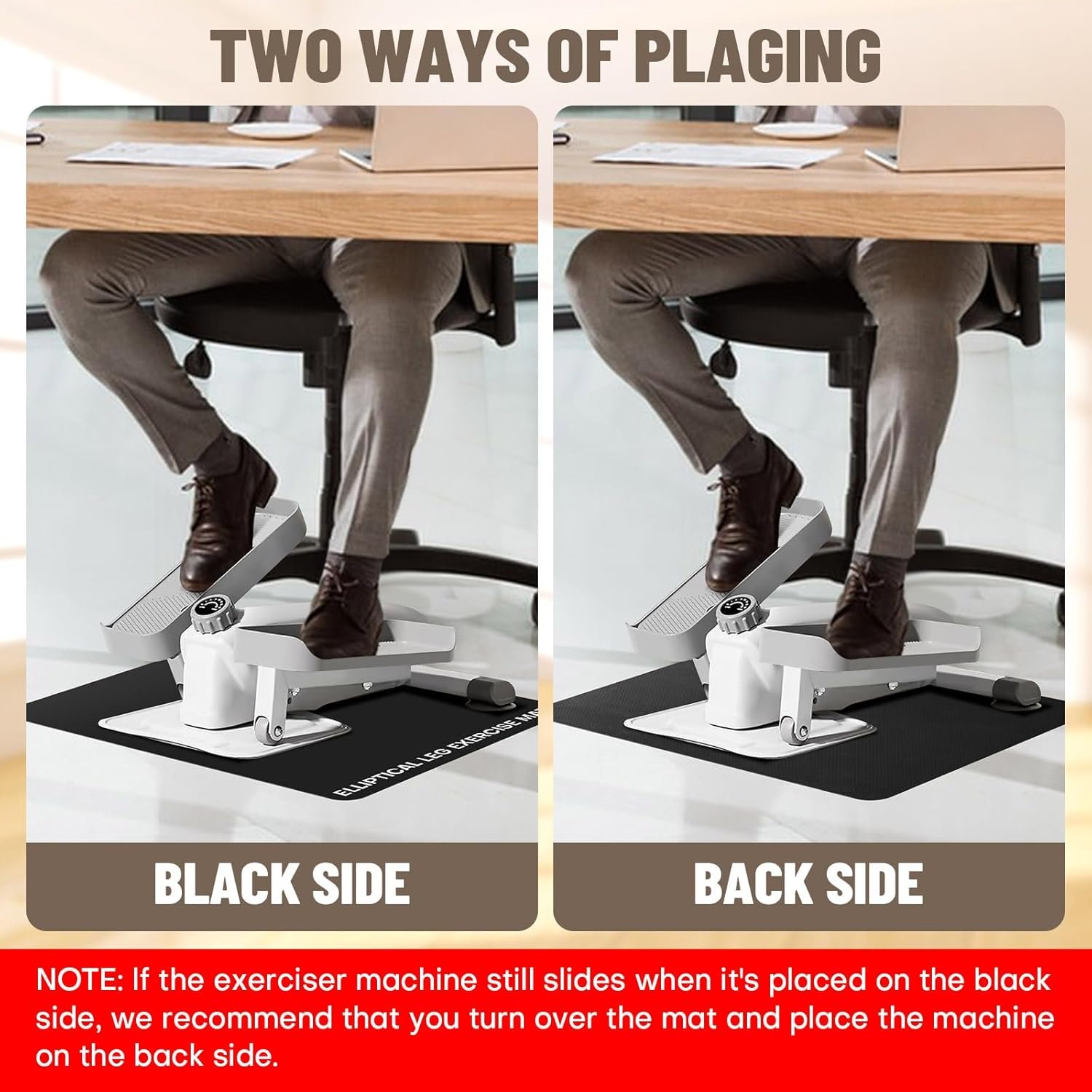 NOTE: If the exerciser machine still slides when it’s placed on the black side, we recommend that you turn over the mat and place the machine on the white side.