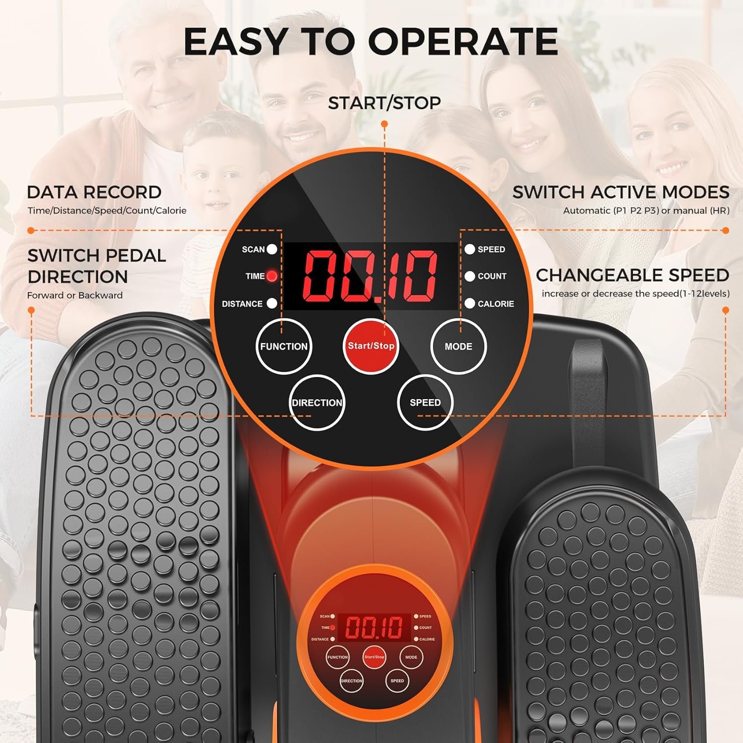 【LCD DISPLAY & REMOTE CONTROL】 Our foot pedals feature a biomechanically-designed arch that supports your feet perfectly, whether you’re wearing shoes or not. The LCD display shows your workout stats including SCAN, TIME, DISTANCE, SPEED, CALORIES and so on. Adjust everything easily using the included remote control—no bending needed.