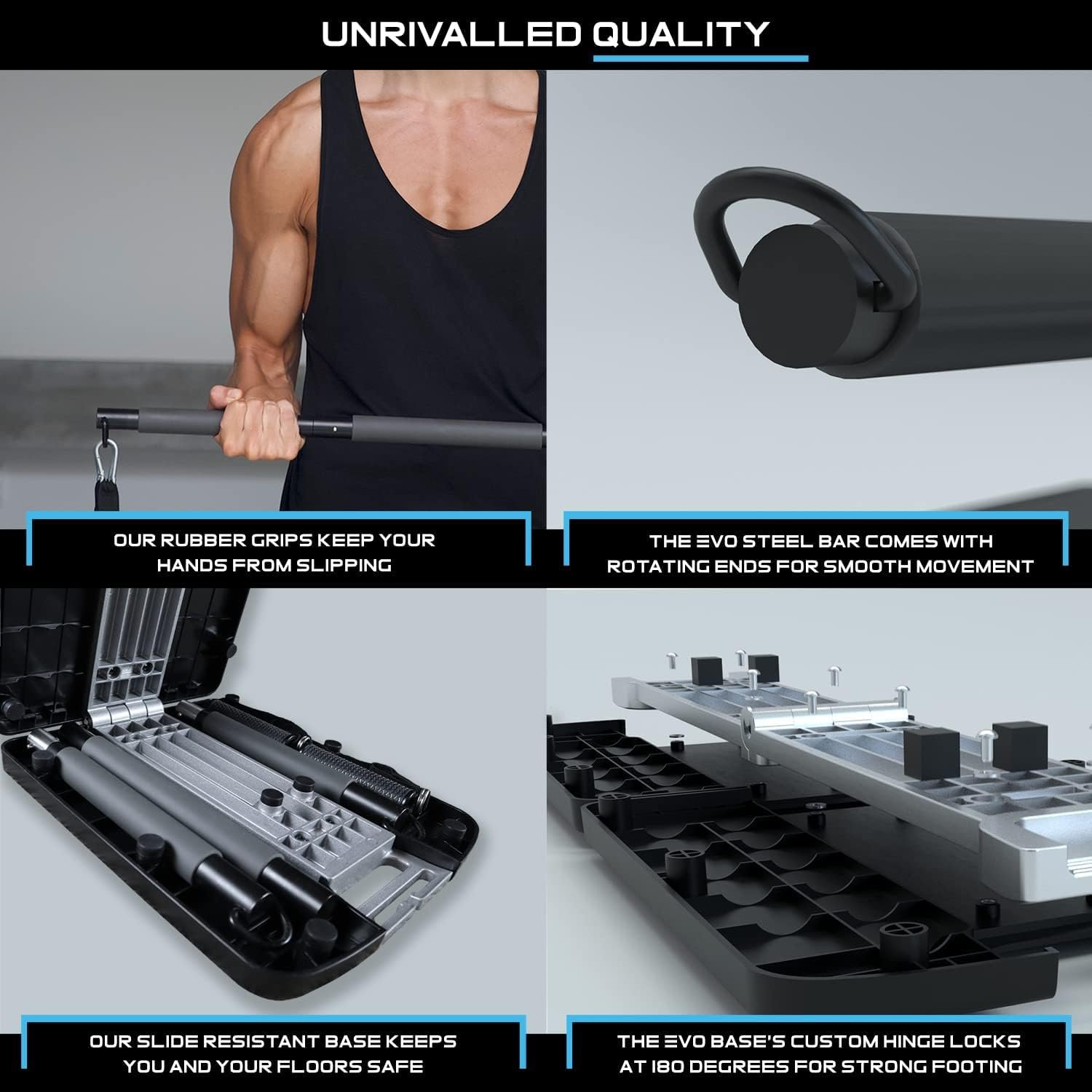MAXIMUM TENSION & MAXIMUM RESULTS – EVO Gym provides a workout experience second to none. Reinforced with Aircraft-Grade Aluminum, our base will never wobble or bend when you load it up for your work out. With EVO Bands, you don’t have to worry about keeping tension when performing movements. Squats, deadlifts, presses. You name it. It just works.