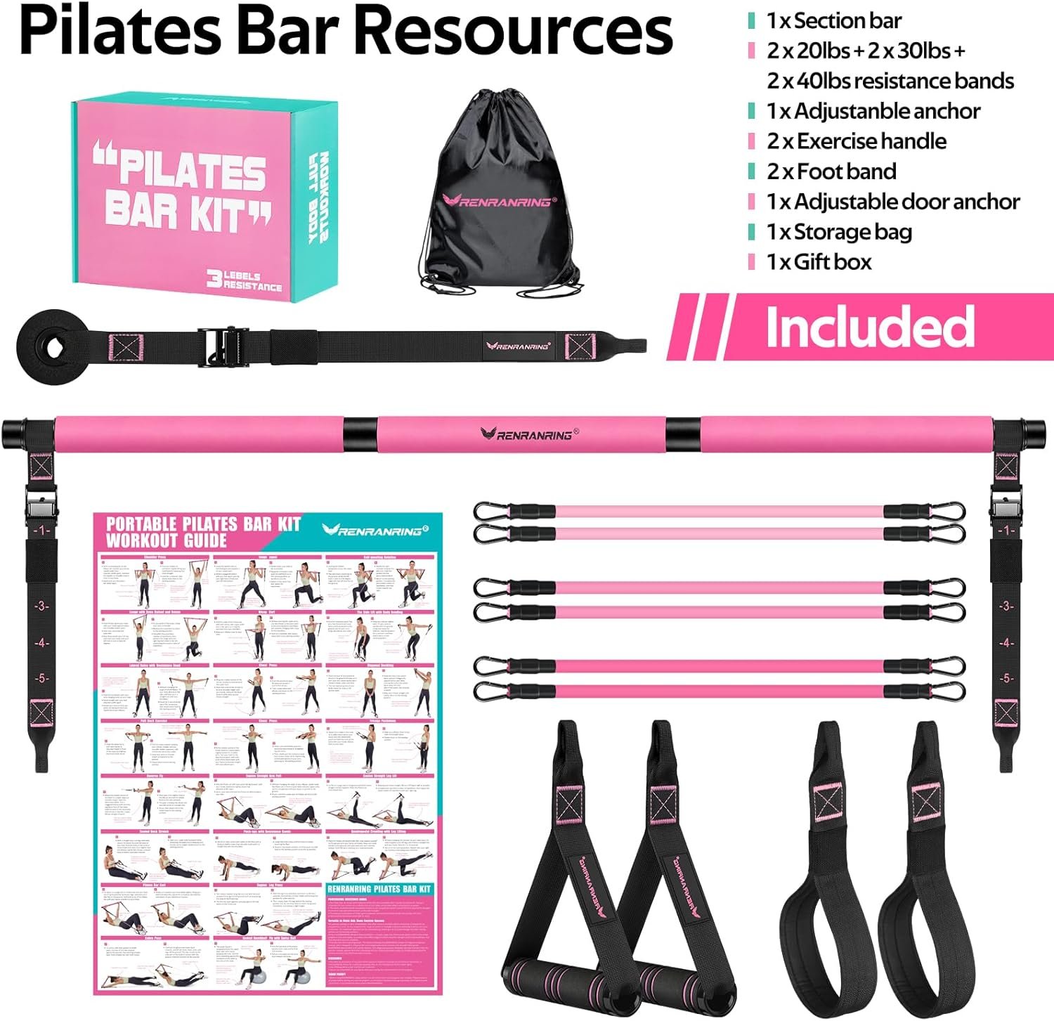 Multifunctional and All-In-One Pilates Bar Kit: The RENRANRING pilates set is the most complete pilates home equipment on the market. It has 1 Multifunctional Pilates Bar, 2 Resistance Bands Handles, 2 Non Slip Foot band, 3 Pair Exercise Bands:20, 30, 40LBS, 1 Door Anchor, 2 Workout Guide, 1 Carry Bag, 1 Box. Multiful matching of pilates gym accessories and resistance bands allow you to enjoy the most professional workout at home
