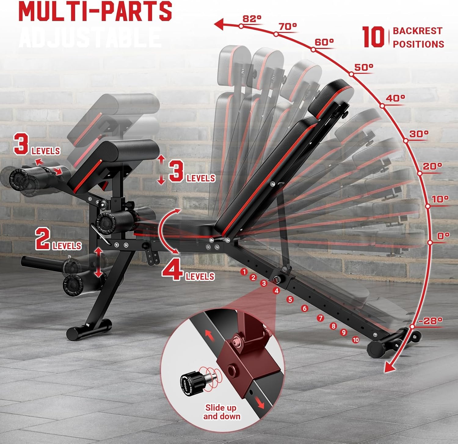 [Versatile & Adjustable] The weight bench has 6 adjustable parts – backrest (10 levels), headrest (7-9 inches), seat (4 levels), preacher curl pad (3 levels), lower hook feet (2 levels), handle (3 gears), allowing you to customize the settings according to your exercise needs for different muscle groups.