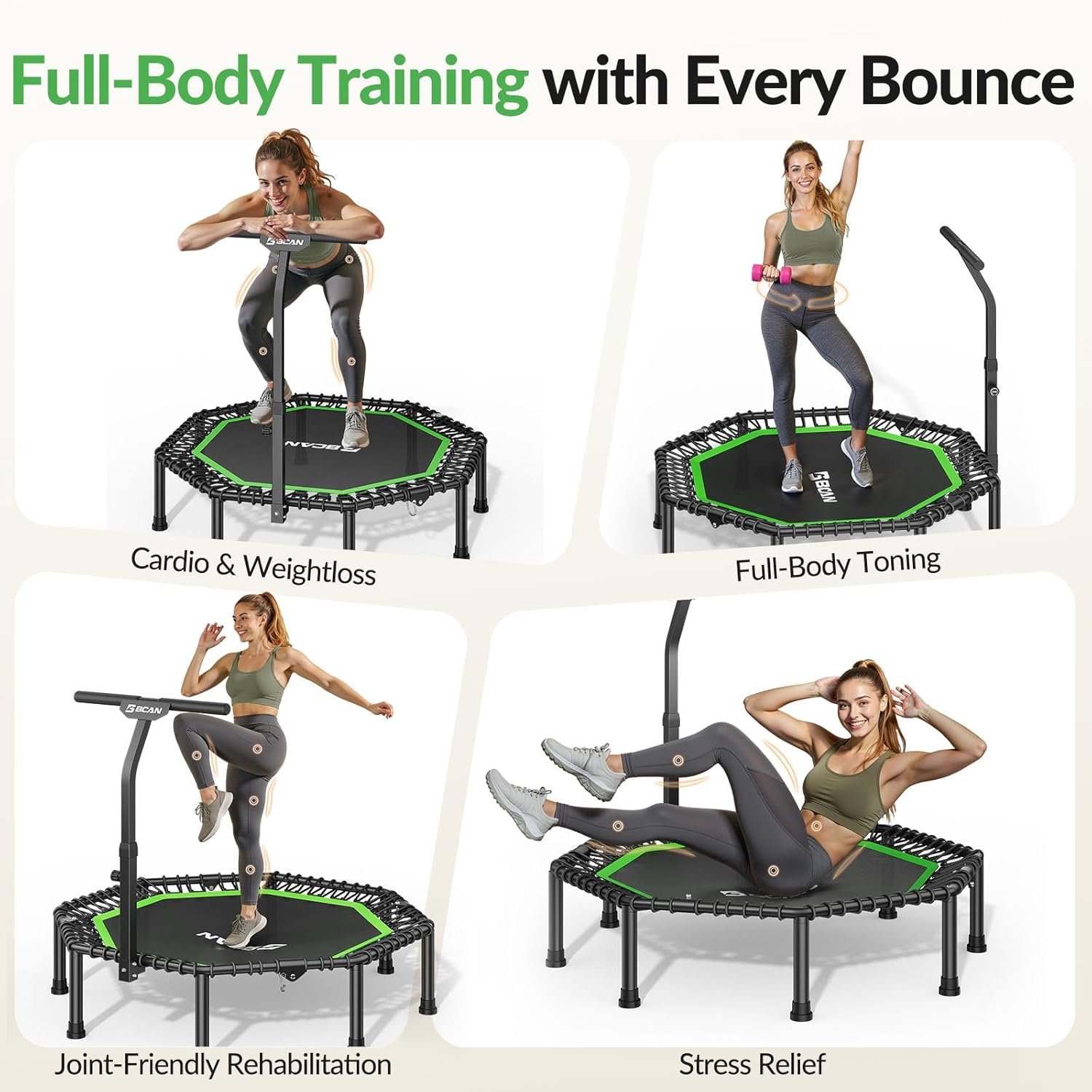 Upgrade Stability Handle: Fitness trampoline is equipped with the latest upgraded stability armrest structure in 2024, which is firm and not easy to shake, adjustable in 3 levels, a height range from 2’6″ to 3’5. Quick-adjust spring knob can quickly adjust the height.