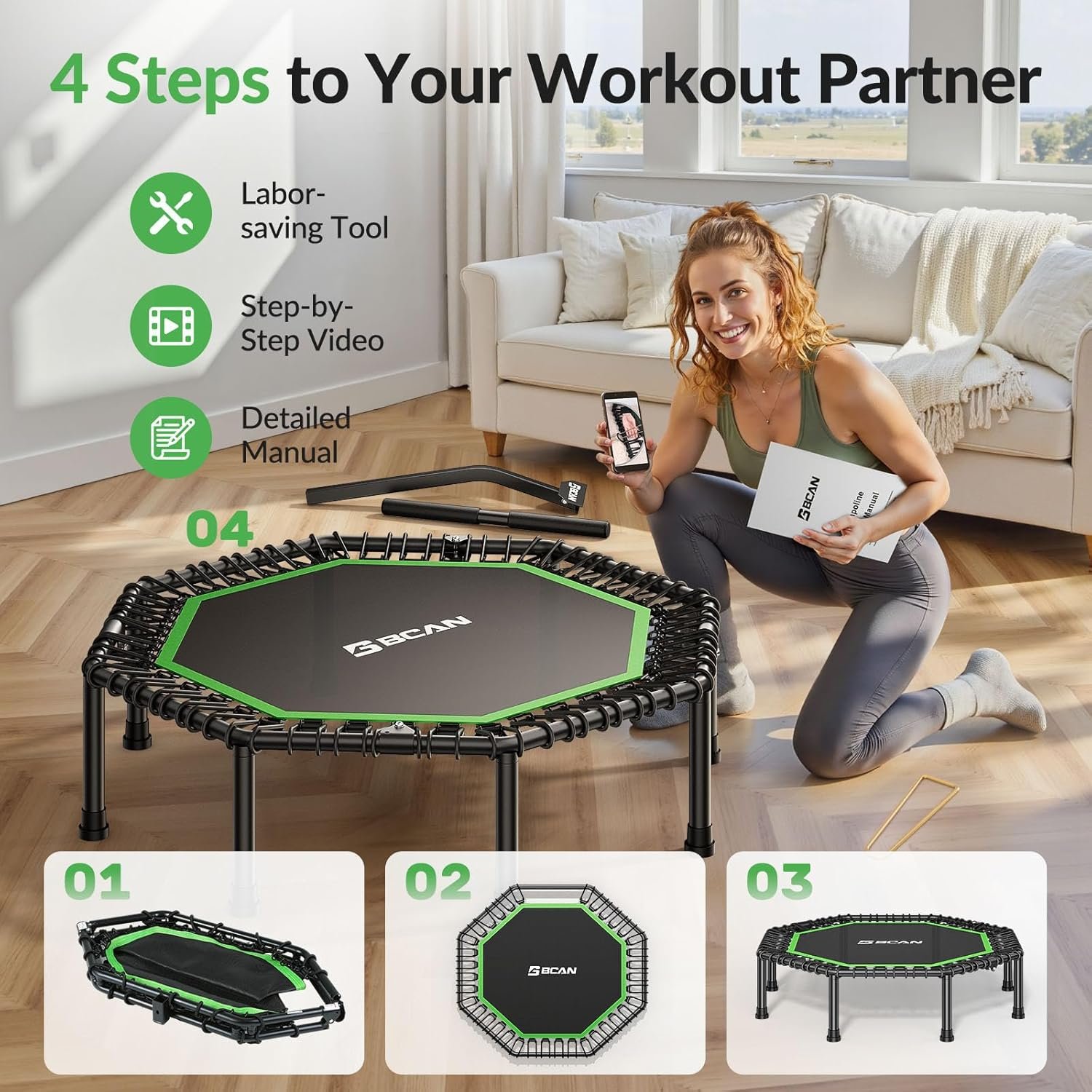 Fairly Easy to Assemble: The fitness trampoline adopts an octagonal foldable design, 50% of the elastic ropes are pre-assembled, and after unfolding, it only takes 10 minutes to assemble with our special tools. Make the installation simple and safe!