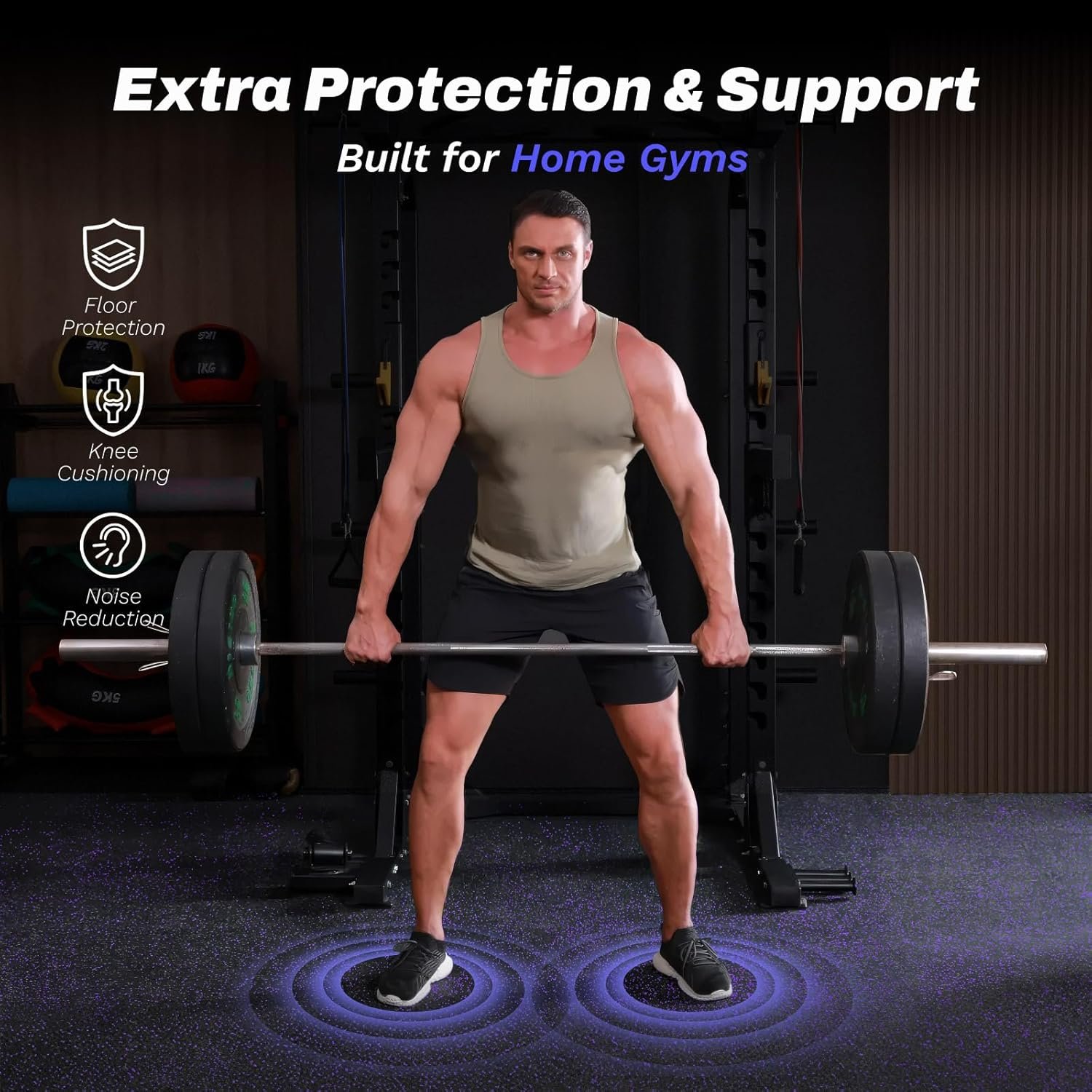 [Sturdy Rubber Build]: Crafted from premium recycled rubber, our gym mats handle intense workouts with ease. These resilient tiles effortlessly support heavy machinery, providing reliable floor protection against scratches, scuffs, and dents from weights, dumbbells, medicine balls, jump ropes, and other workout gear in a home gym.
