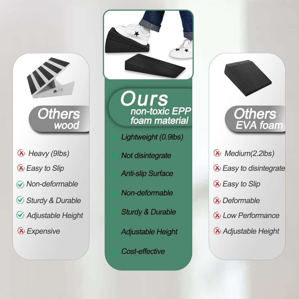 ※ DETAILS MAKE THE DIFFERENCE : Slant Board for Calf Stretching uses EPP environmentally friendly materials that are non-toxic, odorless, waterproof, and oil-proof, 100% recyclable, and almost no performance degradation.foam wedge can withstand 440 lbs.compared with the slant board on the market, our products have the advantages of light weight and easy storage. they can be moved to every place in the house at will and can be reused many times.