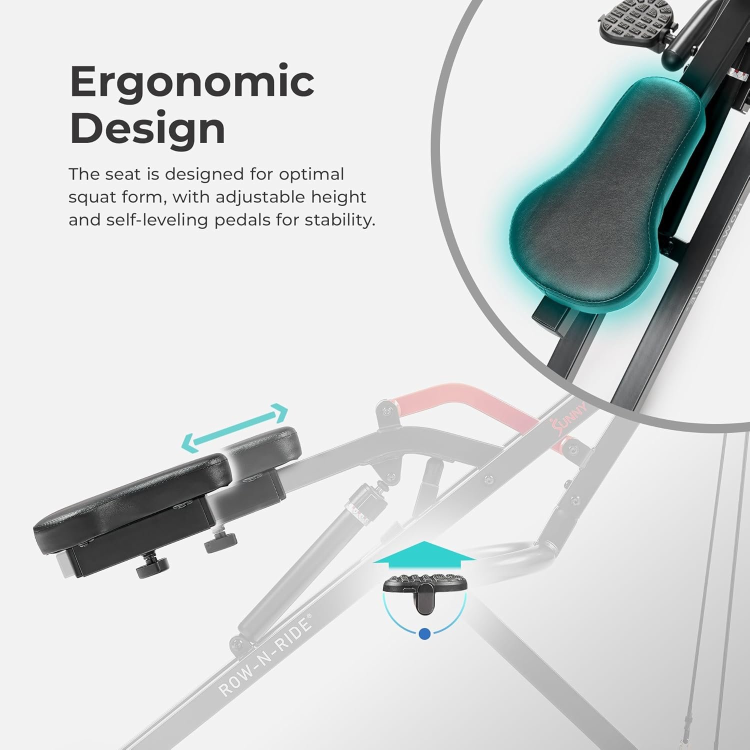 【INTENSE FULL-BODY SQUATS】Designed for precision, the Row-N-Ride PRO incorporates resistance bands and an innovative design to amplify your squat exercises, activating both your glutes and arms for an effective total-body workout.