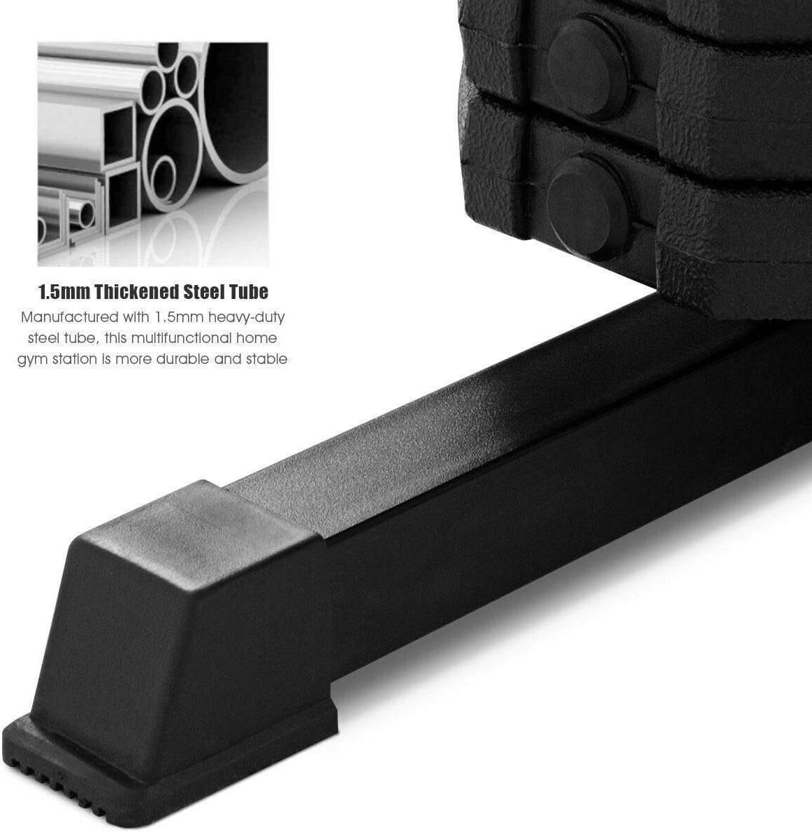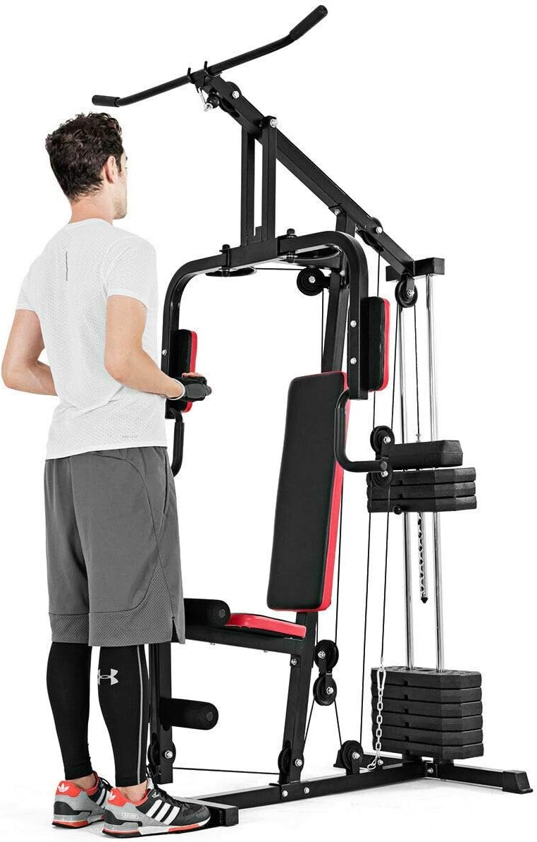 High and Low Pulley System—This home gym has high and low pulleys that can be used for a wide variety of upper and lower body exercises. Total 12 pulleys provide a smooth fluid motion with every movement and strengthen various muscles throughout your back, arms and core.