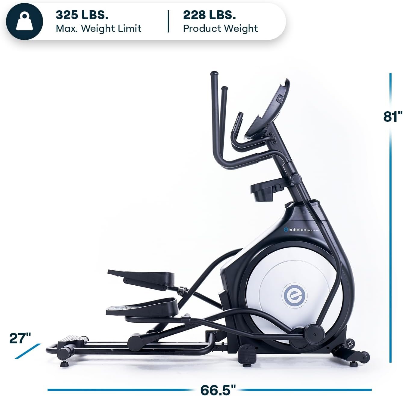 Product Dimensions and Weight Capacity: The assembled ellliptical measures 81″L x 27″ W x 67″ H and supports users up to 325 pounds