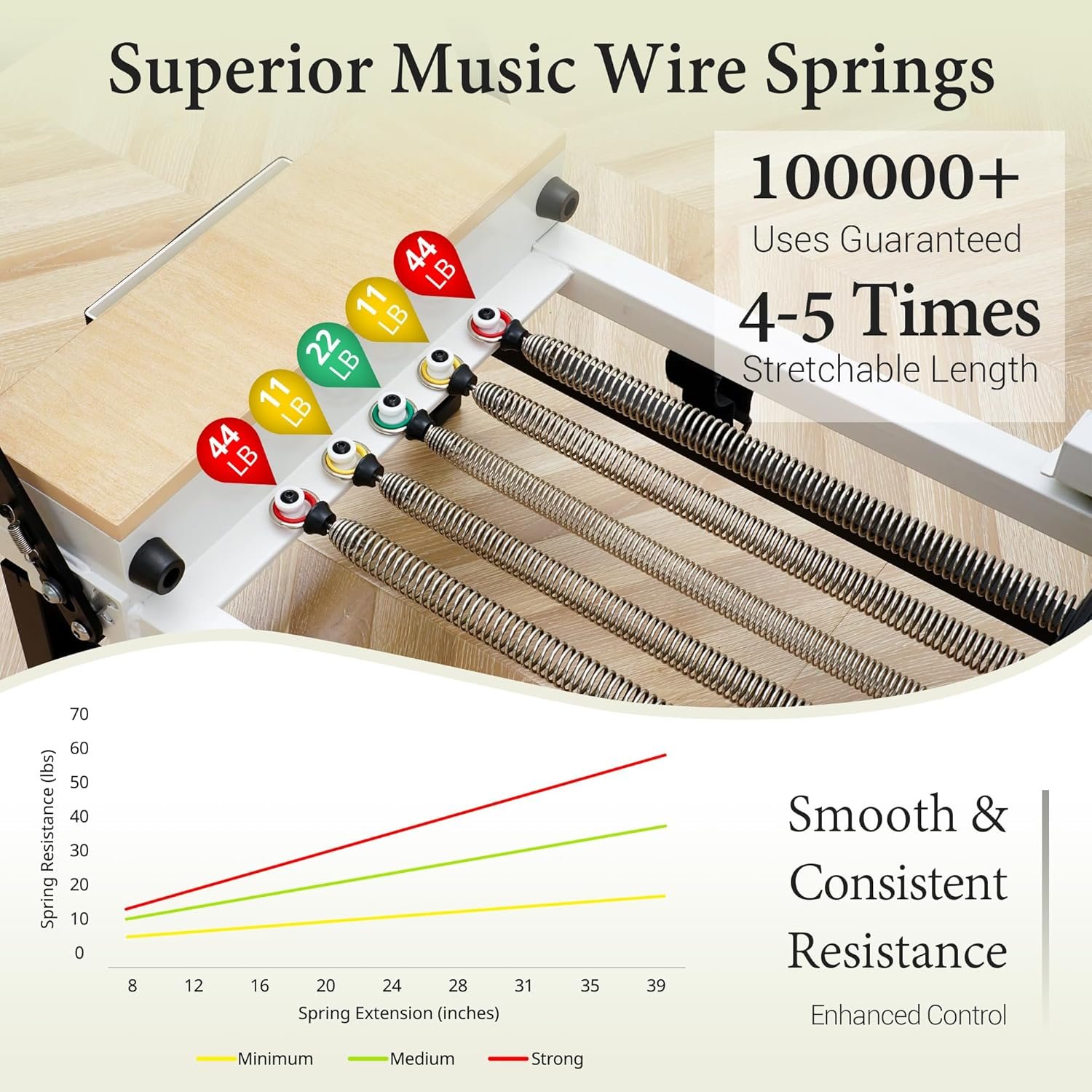 Ultimate Stability and Comfort:Our details produce your results. The pilates reformer machine supports up to 500 lbs with six sturdy legs for enhanced stability. Enjoy premium piano wire springs for smooth, silent operation, designed for over 50,000 uses. The high-density foam padding ensures lasting comfort and support, while ultra-smooth tracks and quiet PU wheels provide effortless gliding. Elevate your pilates practice with our top-of-the-line reformer!