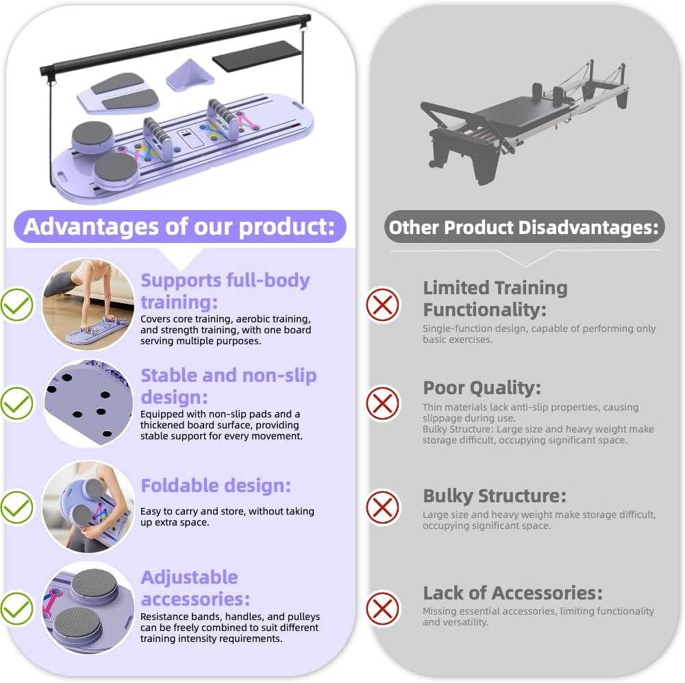 [Upgraded multi Pilates board]The Pilates board combines the functions of a Pilates board, ab roller, resistance band, push-up board, balance board, and thickened knee pads.It strengthens core, abdominal, arm, leg, shoulder, hips, and back muscles. The Pilates Reformer board can be configured into at least 7 forms, unlocking at least 15 exercise movements.It covers nearly all essential workout equipment for home training -the ultimate cost-effective pilates reformer set.
