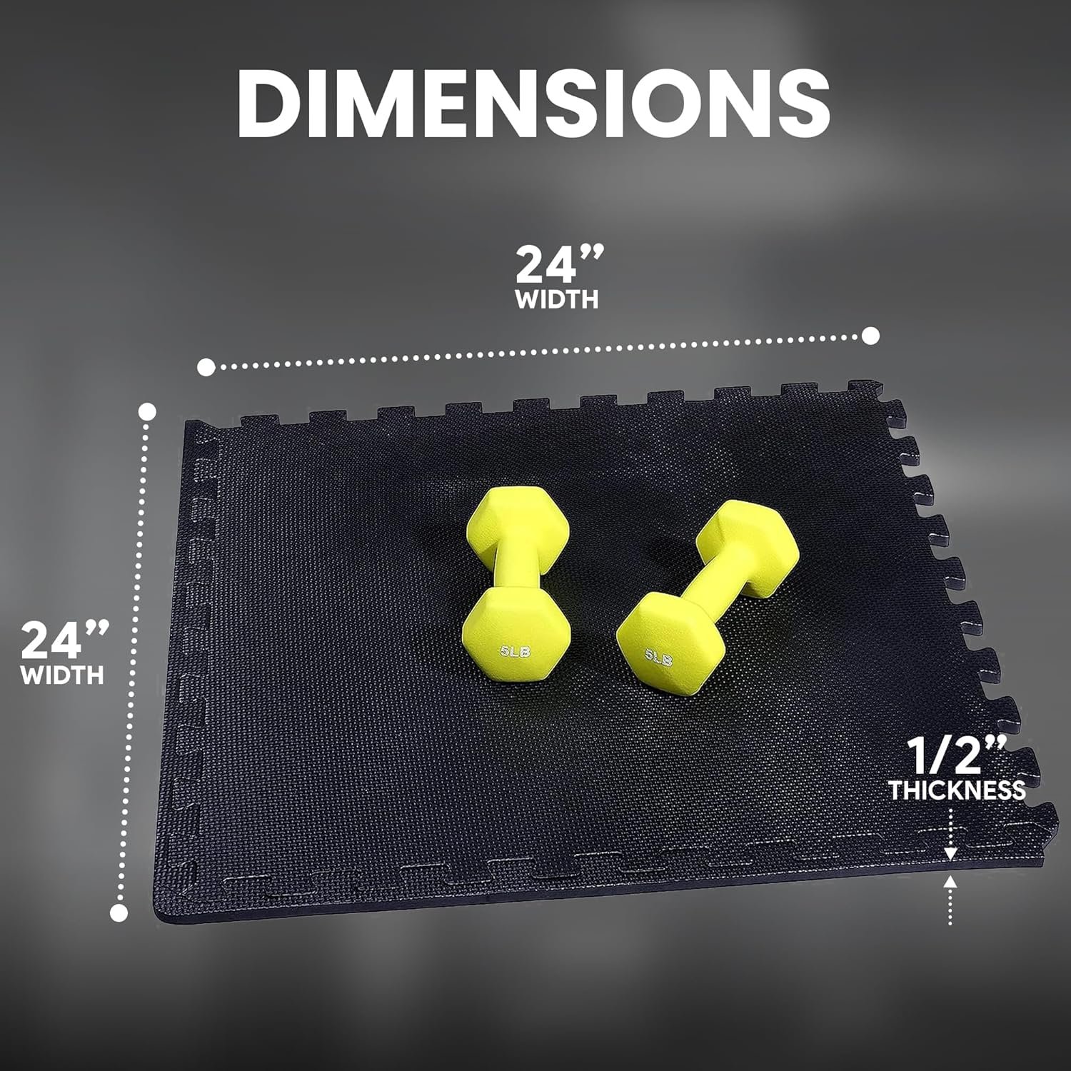 Covers 24 square feet: Each tile measures 24” x 24” x 1/2”- thick from the highest point of the texture; Includes 6 tiles and 12 end borders for a polished look