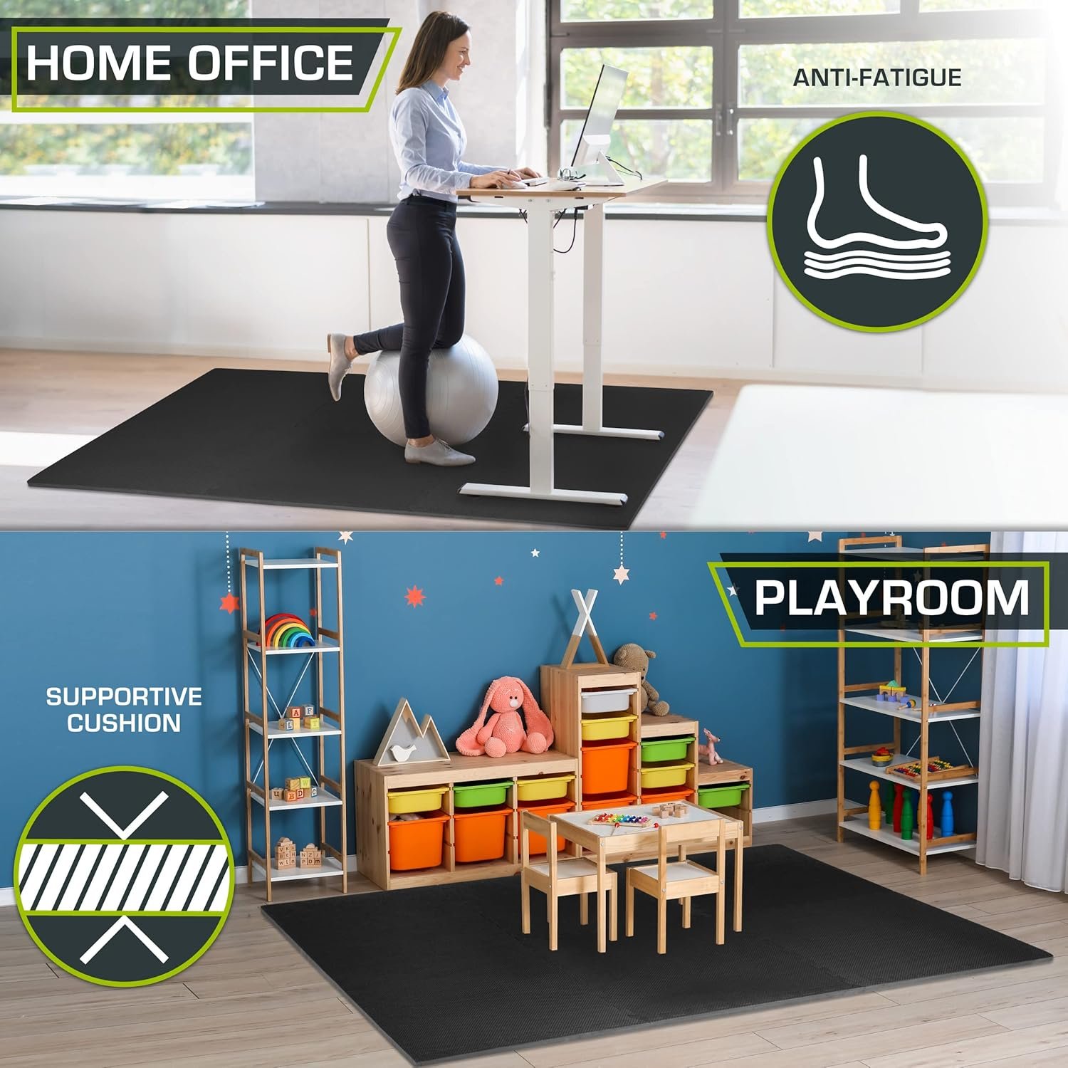 Transform any space into a comfortable workout area with the ProsourceFit Exercise Puzzle Mat ¾” or ProsourceFit Exercise Puzzle Mat 1″. Six extra-thick tiles create protective flooring over wood, concrete or carpet for workouts and gym equipment. This is the perfect solution for anyone looking for an exercise mat or multipurpose flooring thicker than ½” thick. Both mats have great durability, but the 1″ creates more protection for heavier gym equipment and higher traffic. The textured surface has a soft feel with non-skid traction that is low-maintenance. Interlocking pieces are easy to assemble, covering 24 square feet. 12 border pieces help to create a flawless finish. Built to absorb impact and provide cushion to sensitive joints while reducing noise. EVA foam contains no toxic phthalates. Use just a few tiles for smaller spaces, or purchase multiple sets for large areas. Perfect for fitness studios, home gyms, commercial use, children’s play areas, gymnastics or wrestling practice, yoga and more!
