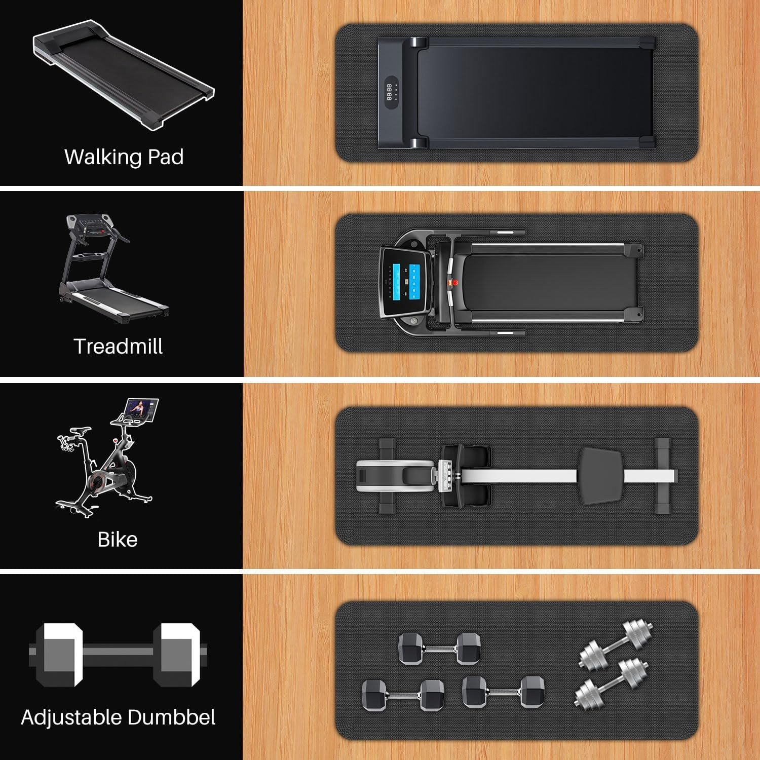 Customizable Fit for Any Space:​​ Available in three convenient sizes (23.6″x60″, 29.5″x70.8″, and 32″x84″) to match different equipment. Easily trim it to your desired shape for a perfect fit under folding treadmills, spin bikes, or weight racks, offering versatile protection across various home workout setups.