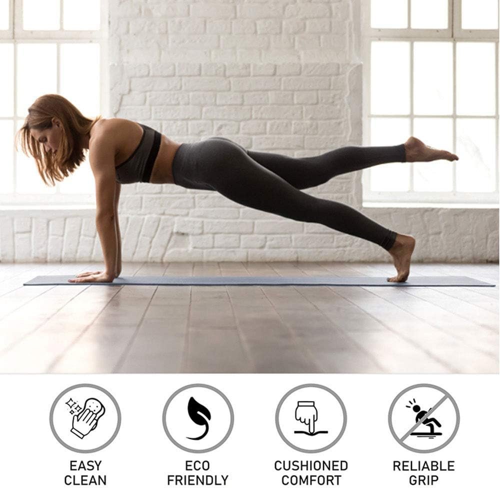EXCELLENT GRIP: This exercise mat for home workouts features a lightly textured surface that stays in place on a variety of different floor types. The non-slip yoga mat is great to take to the gym, yoga classes, yoga studios, vacations or for home use. The extra strong, soft material provides an excellent gripping surface and prevents slips during your yoga practice. The extra thick mat provides an excellent shock absorbing surface and protects your body during regular practice.