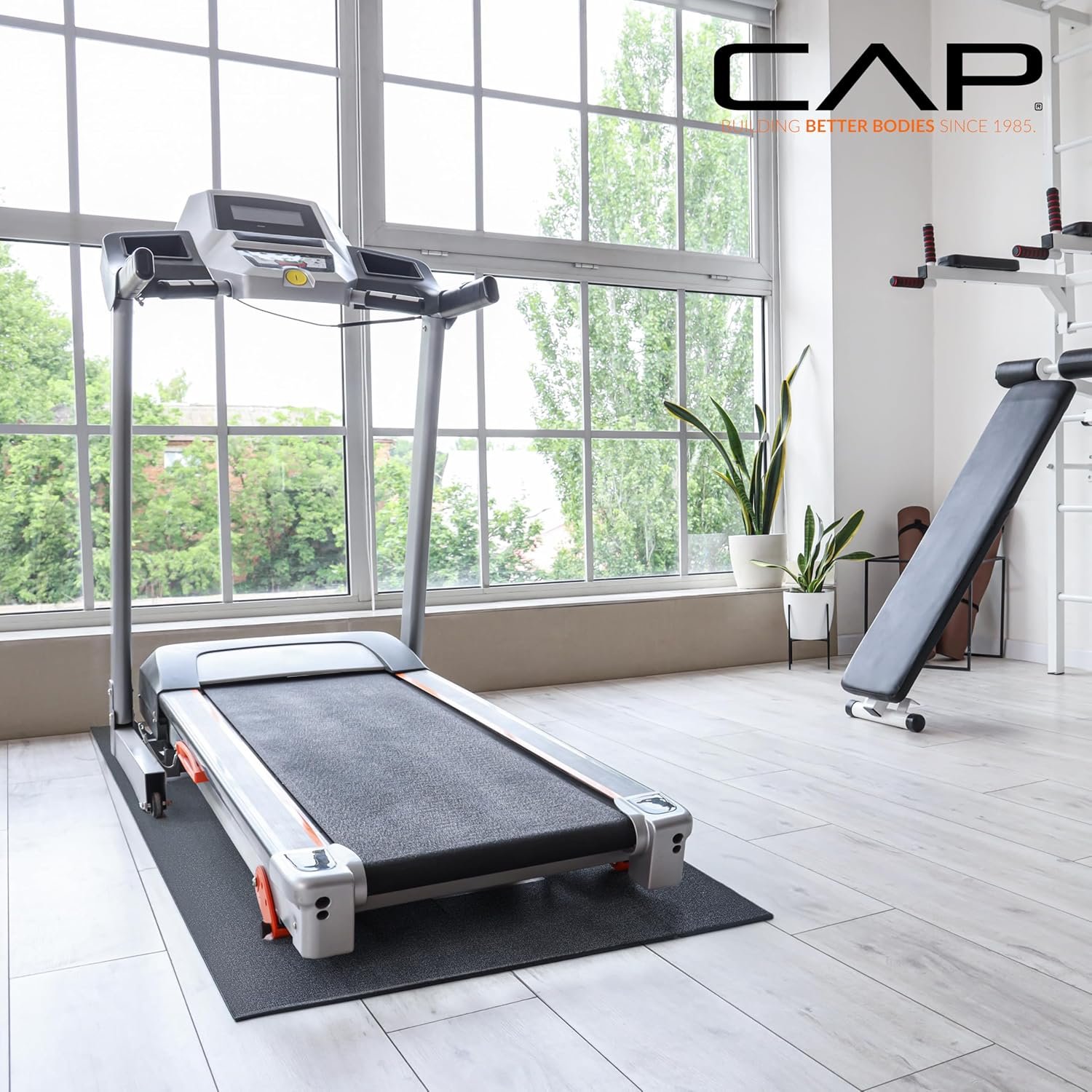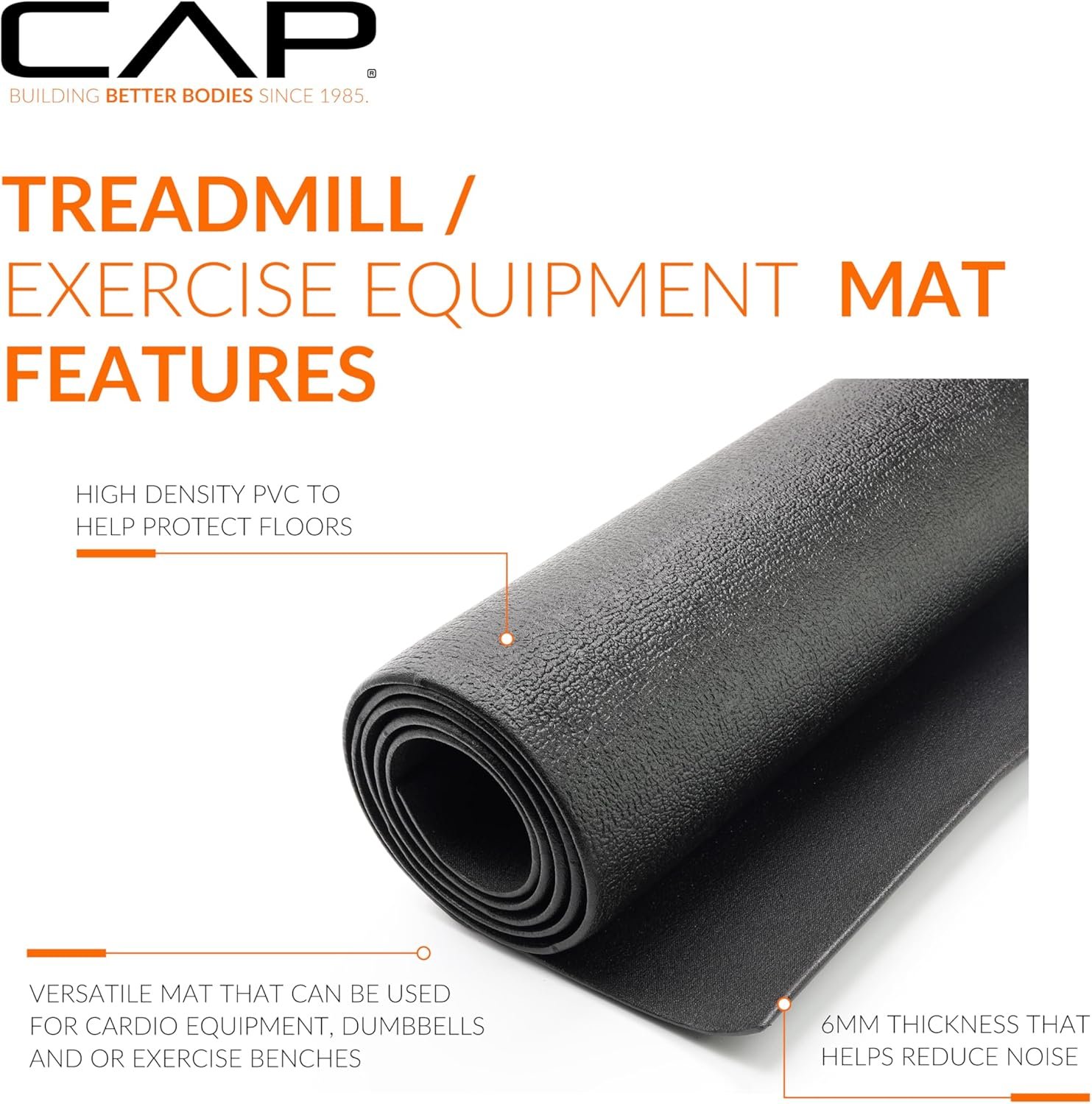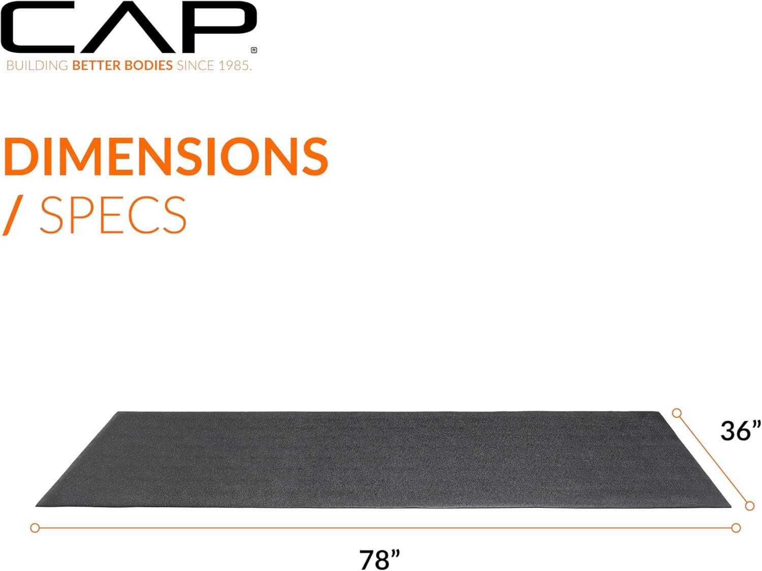 Protect your floors and improve your training setup with the CAP Barbell Premium Exercise Equipment Mat. Measuring 78″ x 36″ (6.5-feet x 3-feet) with a ¼” thickness, this floor protector mat is designed to fit under treadmills, stationary bikes, ellipticals, and other home fitness equipment. Its durable, textured black pebble surface helps prevent slipping, while the dense construction absorbs shock and dampens noise, making it ideal for apartments or shared spaces. Whether you need a treadmill mat for hardwood floors or a treadmill mat for carpet floors, this versatile mat prevents chips, scratches, and stains while extending the life of your flooring and your equipment. It also reduces dust buildup that can damage moving parts, helping machines like treadmills, rowers, ellipticals, and bikes for home gyms perform at their best. Beyond equipment protection, the mat can also be used for standing exercises, stretching, or bodyweight training, giving your home gym an extra layer of versatility. For over 30 years, CAP Barbell has been trusted by athletes and fitness enthusiasts around the world. From treadmill mats and weightlifting flooring to barbells, dumbbells, and racks, CAP continues to deliver reliable solutions for home and commercial gyms alike.