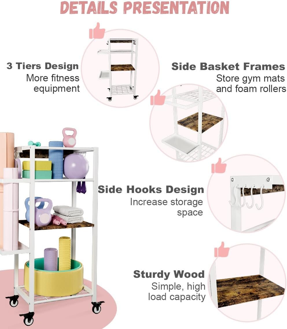 Ardier gym organizers can accommodate yoga mats, foam rollers, resistance bands, dumbbells, yoga blocks, jump ropes and other workout equipment.Keep your home fitness equipment organized and easily accessible with this gym organizer. Say goodbye to clutter and welcome a more efficient exercise space to make your exercise more convenient.