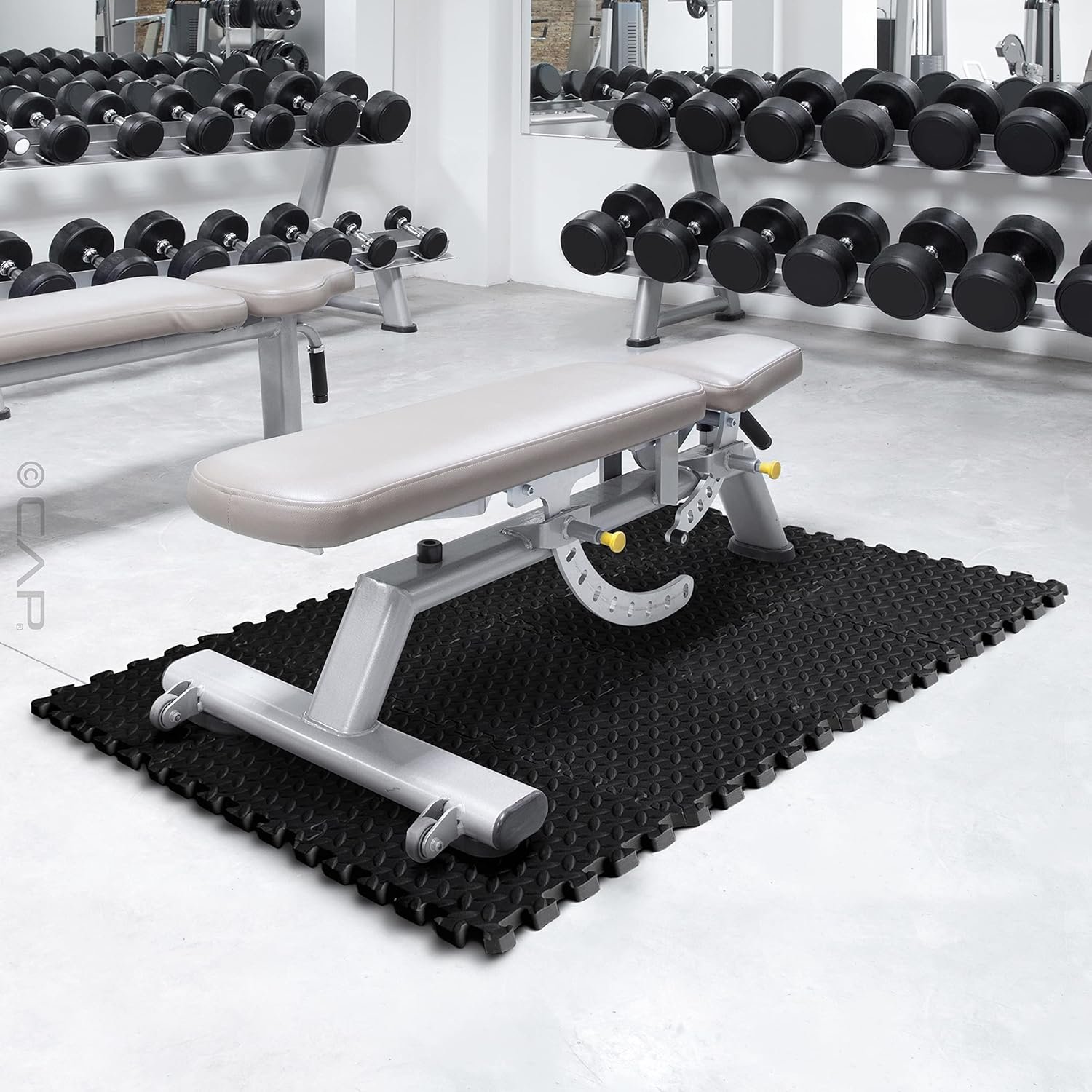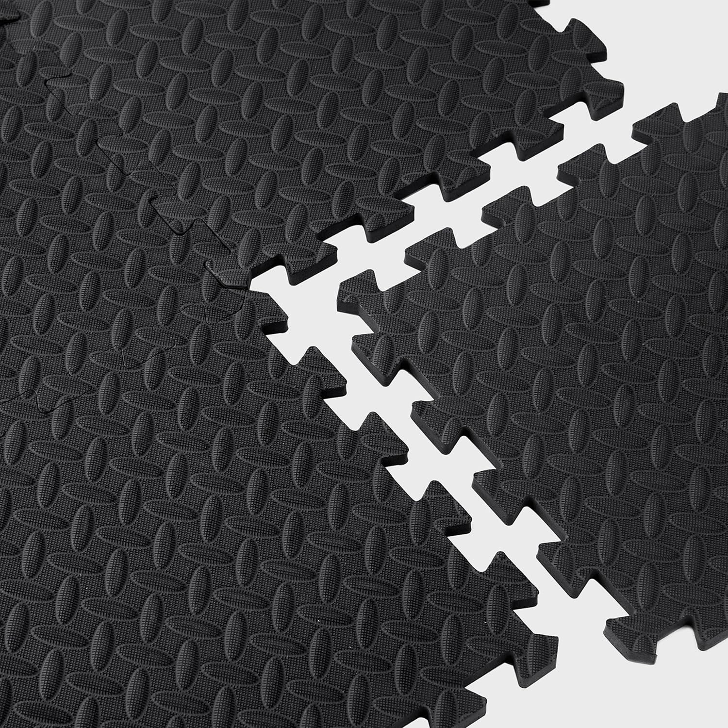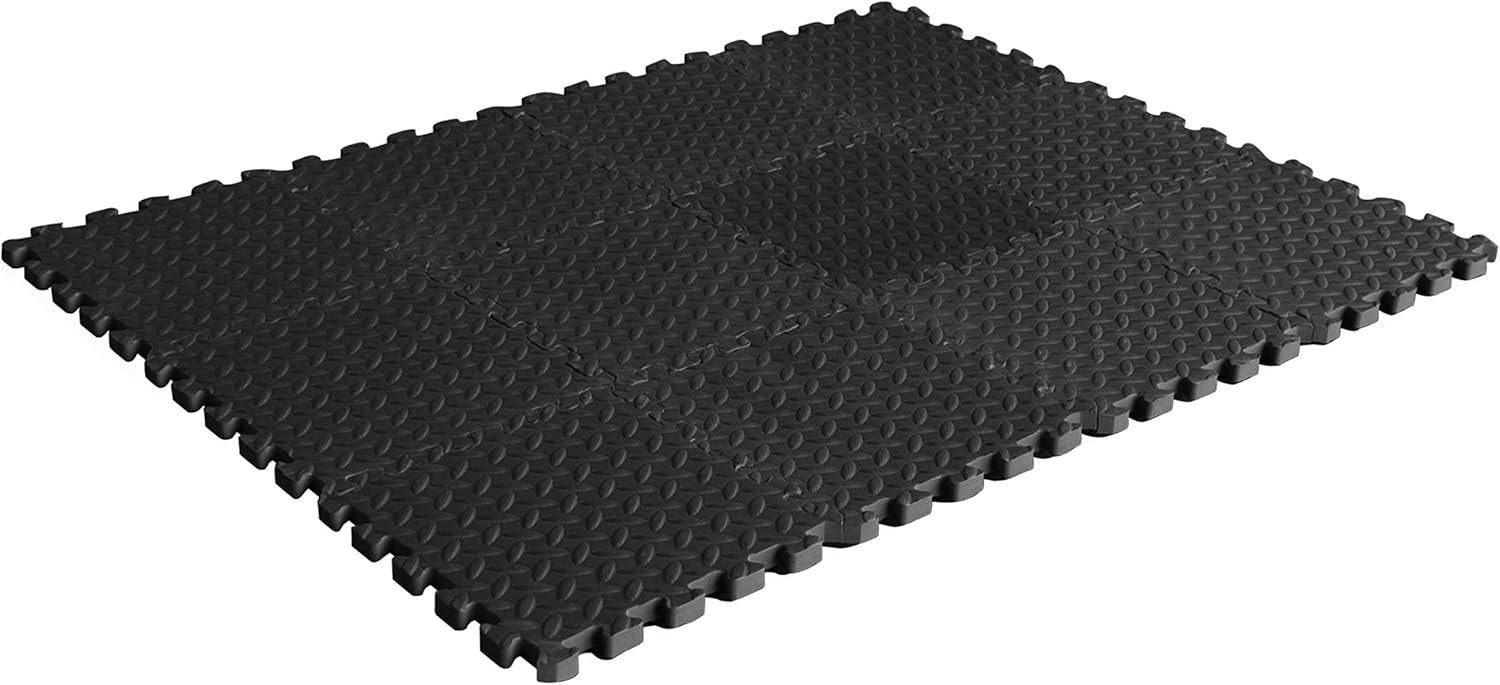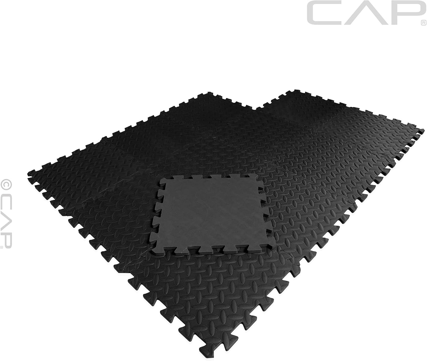 The CAP Exercise Mat Interlocking Puzzle Mat with Diamond Plate Texture features a black diamond plate texture design and is made with lightweight, water-resistant foam. The materials used to design this mat provide a shock absorbing surface to reduce noise and protect the joints while exercising. Includes 12 pieces of 12” x 12” x ½” interlocking puzzle pieces for a total of 12 square feet coverage and has a thickness of ½-inch. The border edges are NOT included.