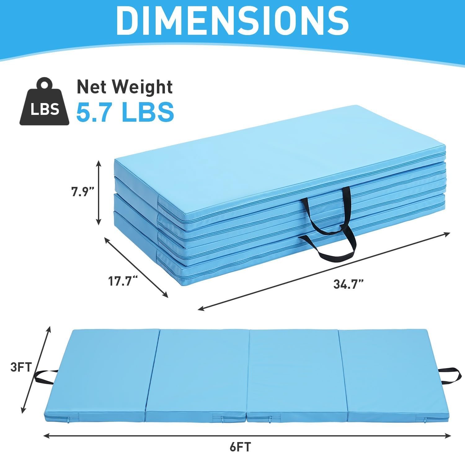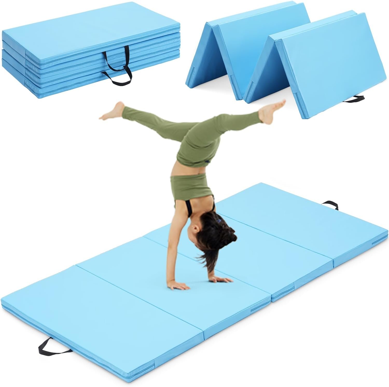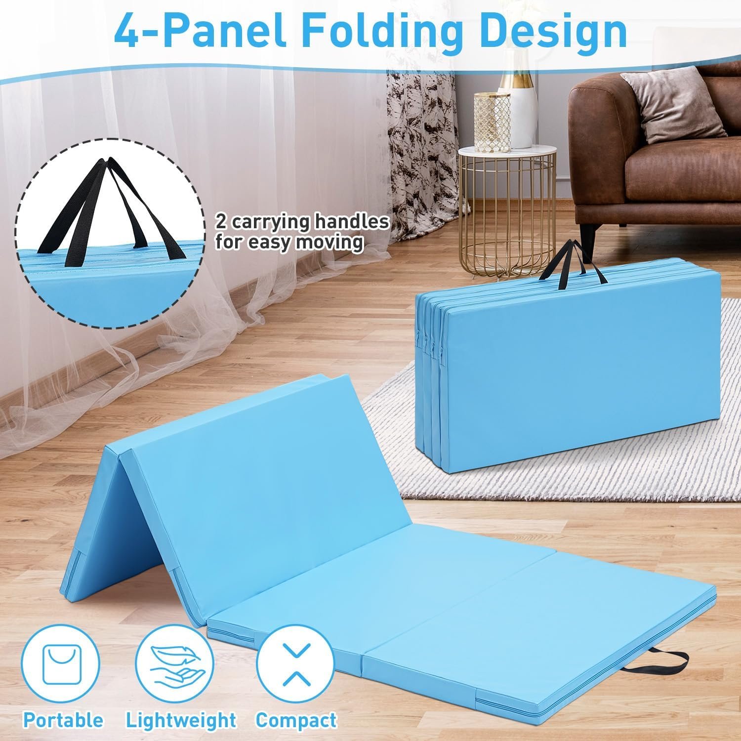4-Panel Folding Design – The gymnastics mat for home is composed of 4 panels and can be easily folded, making the lightweight gym mat easy to store. With 2 handles, it is also convenient to carry the tumbling mat for outdoor activities.