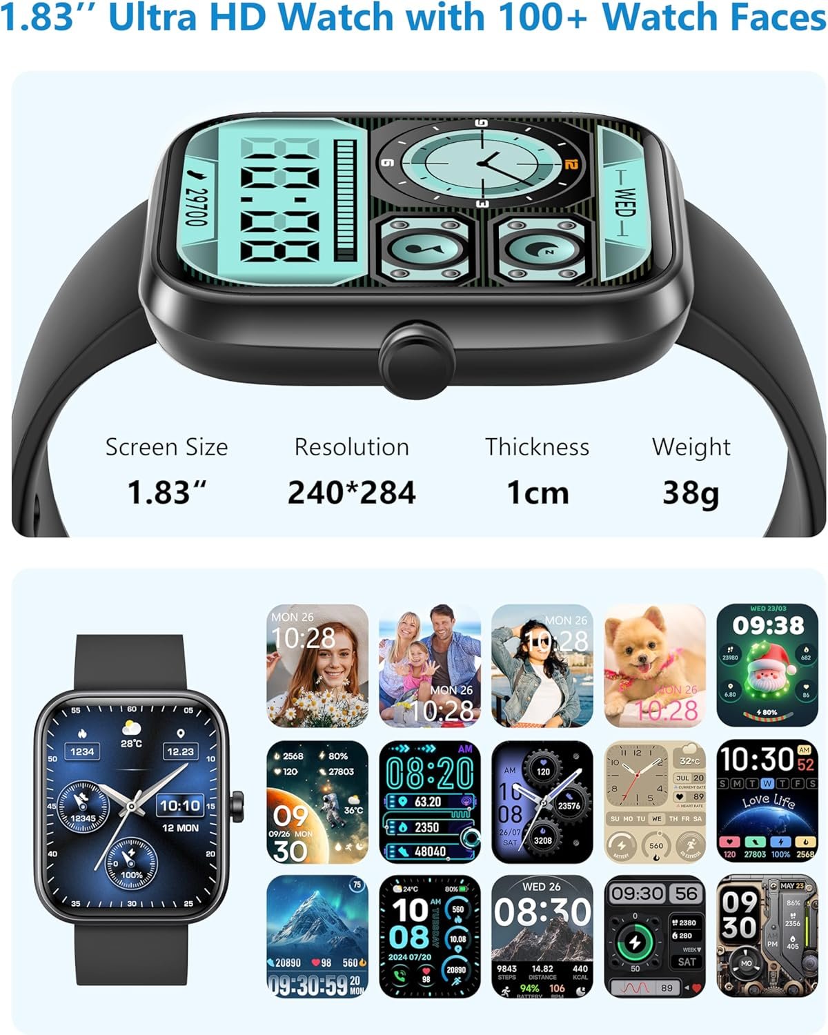 All-in-One Health Partner Smartwatch: The fitness watch separately monitor blood oxygen, stress and 24/7 heart rate, 𝐢𝐧𝐬𝐭𝐚𝐧𝐭𝐥𝐲 𝐚𝐥𝐞𝐫𝐭𝐢𝐧𝐠 𝐲𝐨𝐮 𝐨𝐟 𝐚𝐧𝐲 𝐢𝐫𝐫𝐞𝐠𝐮𝐥𝐚𝐫𝐢𝐭𝐢𝐞𝐬. What’s even more impressive is its newly upgraded detection technology that enables you to measure them simultaneously with just one click, saving time and ensuring efficiency. The activity watch will monitor your sleep and breathing quality in real time, which keeps you informed of the basic health status. The health watch can remind you to drink water, wash hands and move around. For women, it thoughtfully include a menstrual cycle tracking feature to manage your period.
