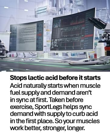 UNINVITE LACTIC ACID. You deserve to hurt less. SportLegs pre-workout vitamins reduce the lactic acid that makes exercise feel like torture. It primes your muscles with lactate, the natural fuel your muscles share during intense exercise, so they work better, like you trained an extra month. So exercise feels more like fun, less like punishment.