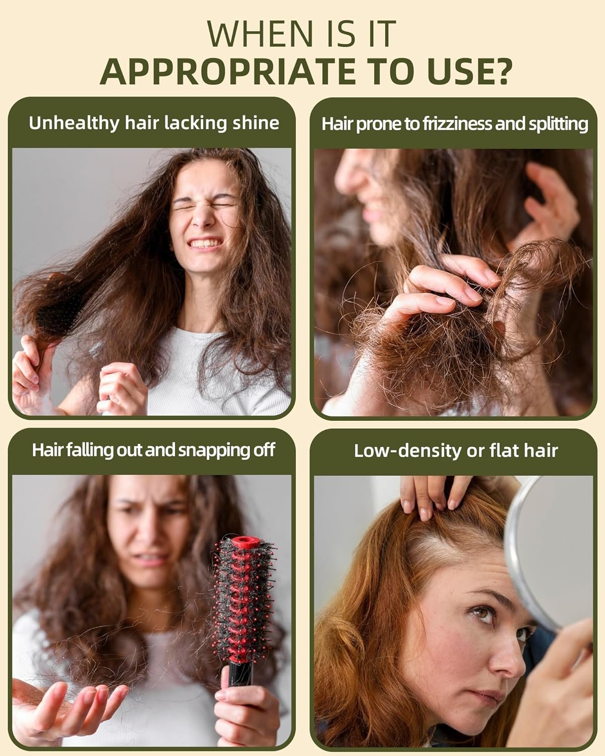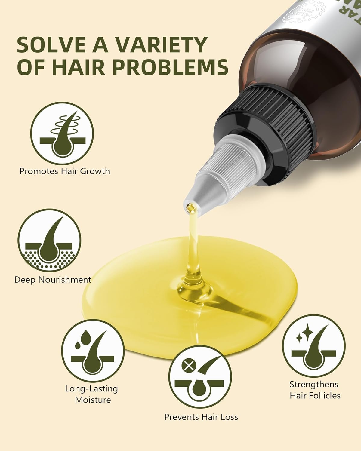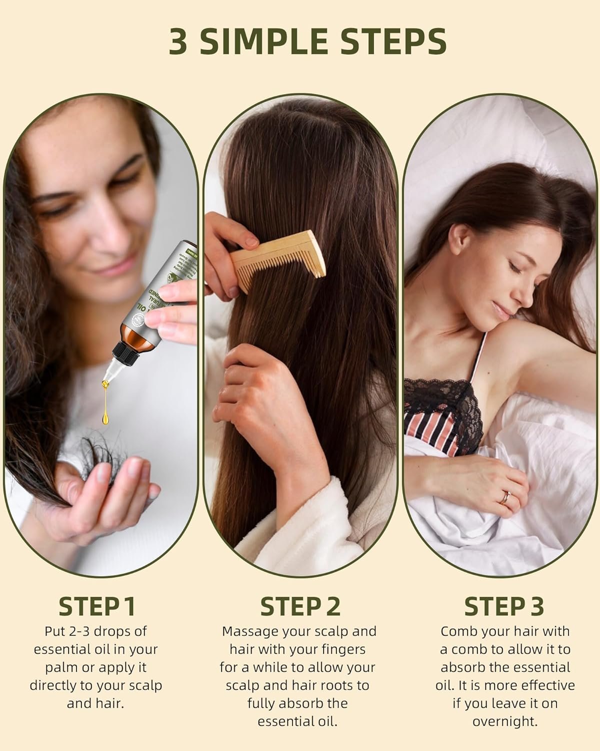 Easy to use: Apply 2-3 drops of essential oil to the palm of your hand or directly to the scalp and hair. Massage with your fingers for a moment to help the scalp and hair roots absorb the oil. Comb your hair to aid absorption and protect damaged strands. Do not blow dry immediately after combing; leaving it to dry naturally overnight will give the best results.