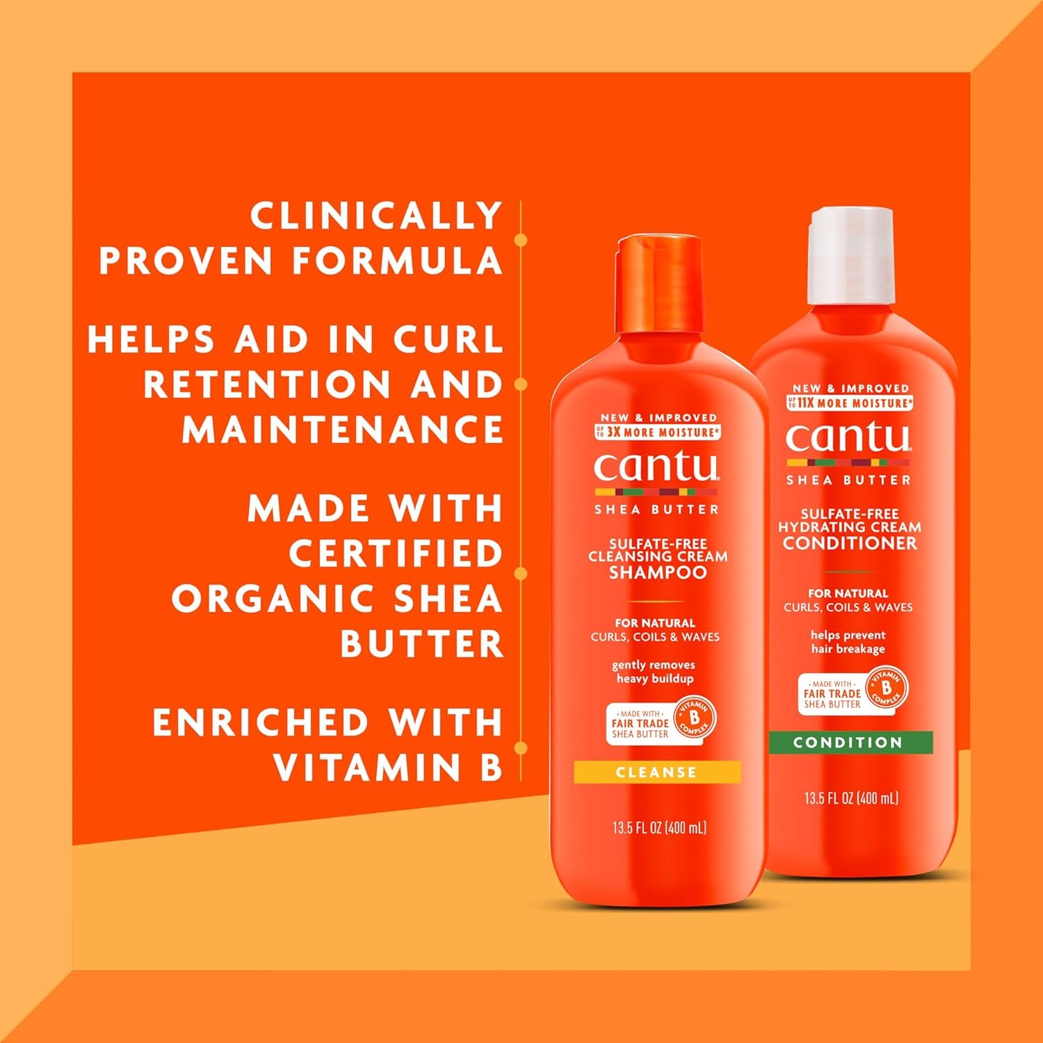 Do wash day the right way with Cantu Shea Butter for Natural Hair Sulfate-Free Cleansing Cream Shampoo and Cantu Shea Butter for Natural Hair Sulfate-Free Hydrating Cream Conditioner! Crafted with an award-winning blend of pure shea butter and essential oils, the Cleansing Cream Shampoo produces a rich lather that conditions as it cleanses, gently removing product buildup without drying out hair. For best results, apply a quarter-sized amount to wet hair and work into a lather. Massage into the scalp, and rinse. Repeat as needed. For best results, follow up with the Hydrating Cream Conditioner to help protect curls against breakage and split ends for stronger, healthier hair for best results and enjoy ultimate hydration and complete conditioning that delivers an added layer of moisture after shampooing. Enjoy ultimate cleansing, hydration and complete conditioning, formulated without the use of harsh ingredients like mineral oil, drying alcohol, sulfates, parabens, silicones, phthalates, paraffin, or propylene. Since the beginning, you’ve pushed us to advance skin and hair science to honor your locs, your curls, your waves, your braids, your natural. At Cantu, we support your journey with care and we celebrate all the styles you rock!