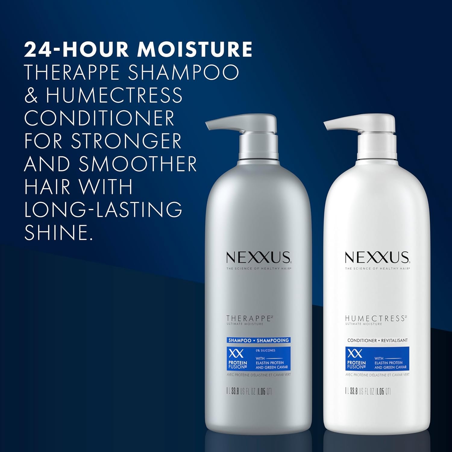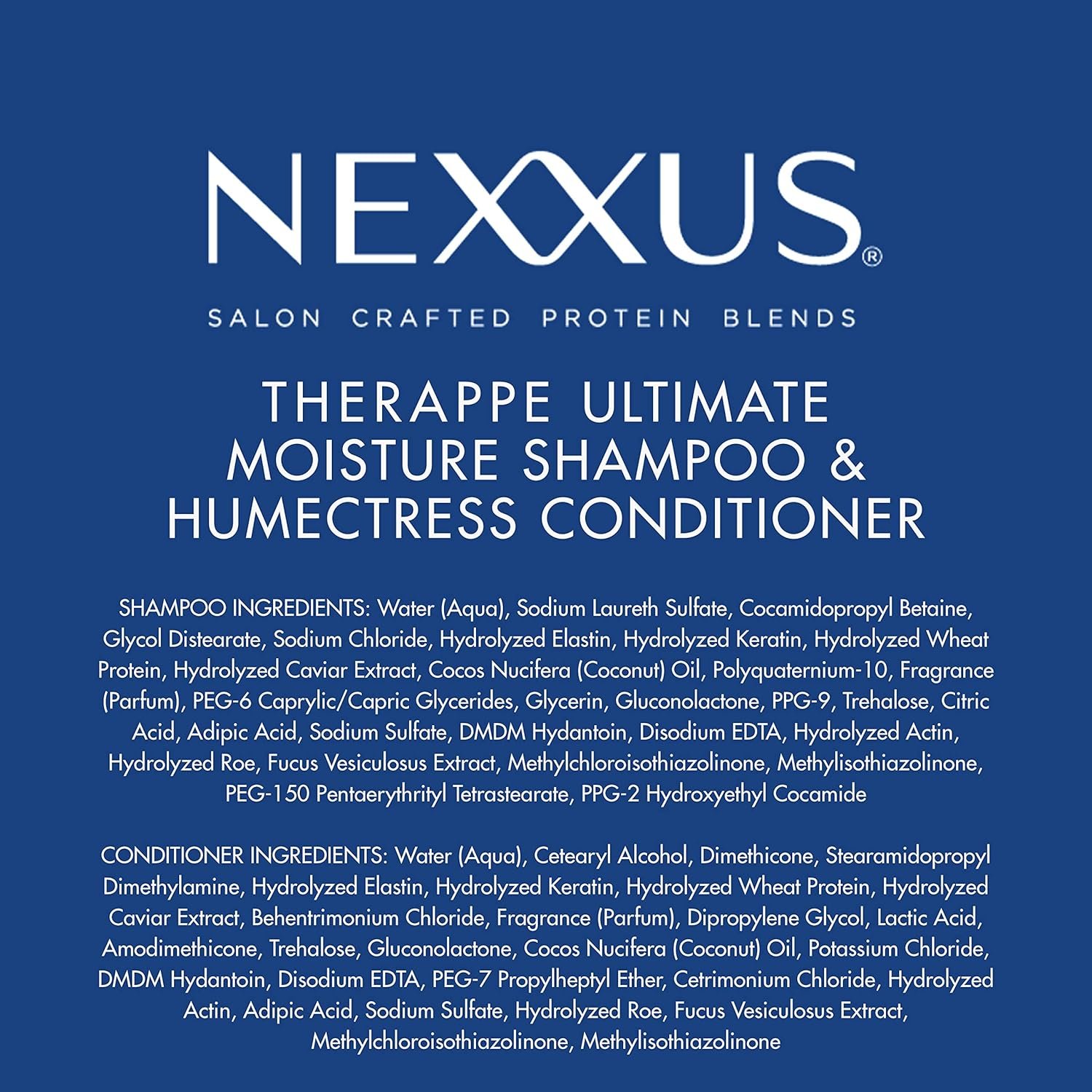 Salon-crafted with Nexxus’ exclusive Caviar & Protein Complex, this shampoo and conditioner pair helps nourish hair and deliver deep hydration, fortifying the surface of hair to lock moisture in for 24 hours. Our Moisturizing Shampoo has a lightweight, silicone-free formula that revitalizes hair without weighing it down, helping to give hair the flexibility and suppleness needed to retain its natural movement. Ultimate Moisture Humectress Conditioner provides advanced conditioning to help replenish and reawaken hair, unleashing your hair’s natural smoothness all day long. Repairing hair is a multi-step process. For best results, apply Moisture Shampoo for dry hair to damp hair, massaging into a rich lather before rinsing thoroughly. Follow with the Humectress Conditioner, smoothing onto wet hair and waiting 3 minutes before rinsing. For optimized results, use Humectress Hair Masque and finish with Luxe Lightweight Conditioning Hair Mist to lock in moisture. Both Therappe Shampoo and Humectress Conditioner are suitable for everyday use. A leader in salon-quality hair products, Nexxus uses learnings from science and nature. Nexxus uses advanced scientific methods to identify the protein needs of each hair type and create customized formulas with proteins to bring your hair back to life.