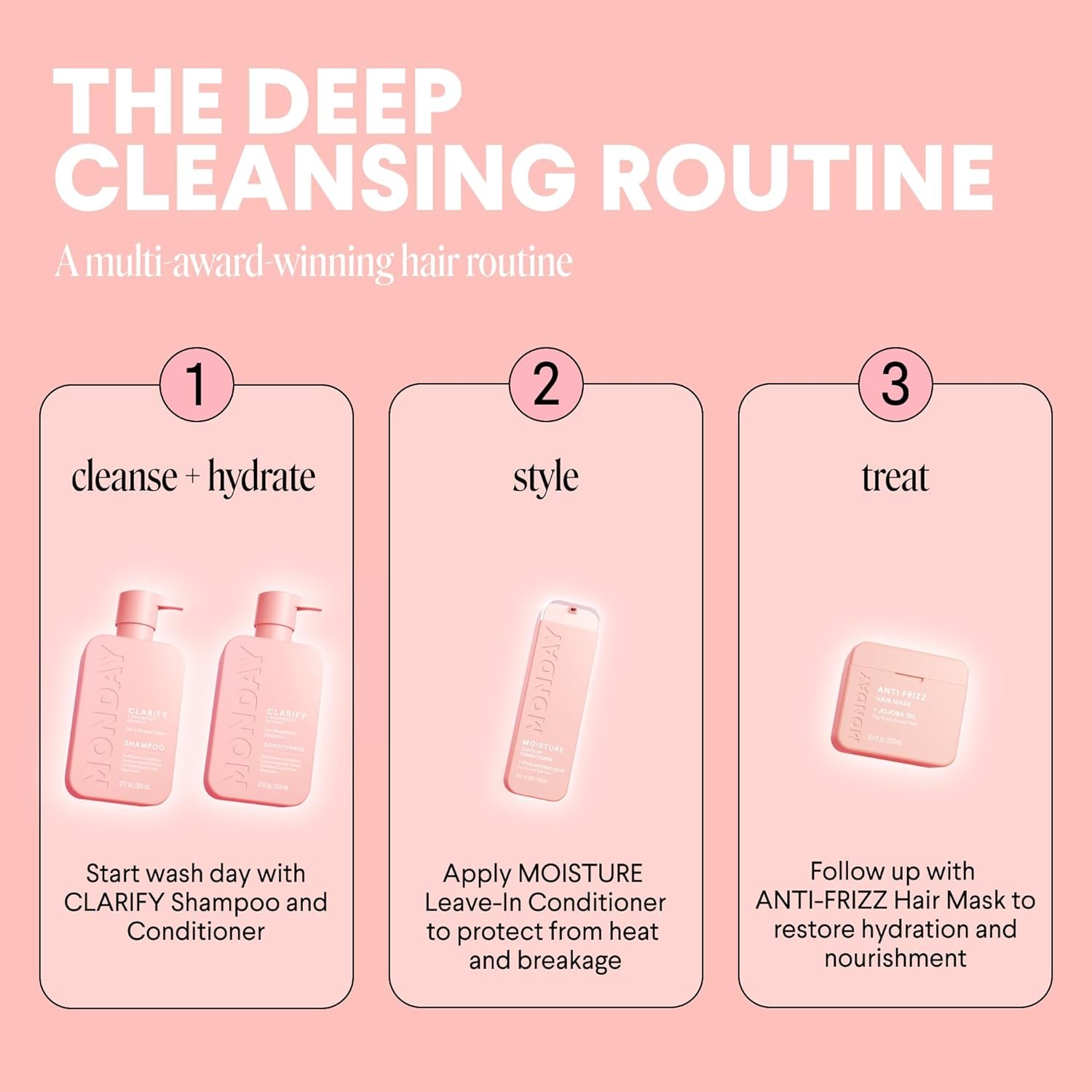 CLARIFY SHAMPOO & CONDITIONER: Monday Hair care CLARIFY Shampoo and Conditioner incorporates active ingredients, antioxidant Grapefruit Extract and essential Ceramides to provide a deep cleanse for hair with excess oil and build-up—leaving it feeling refreshed and balanced.