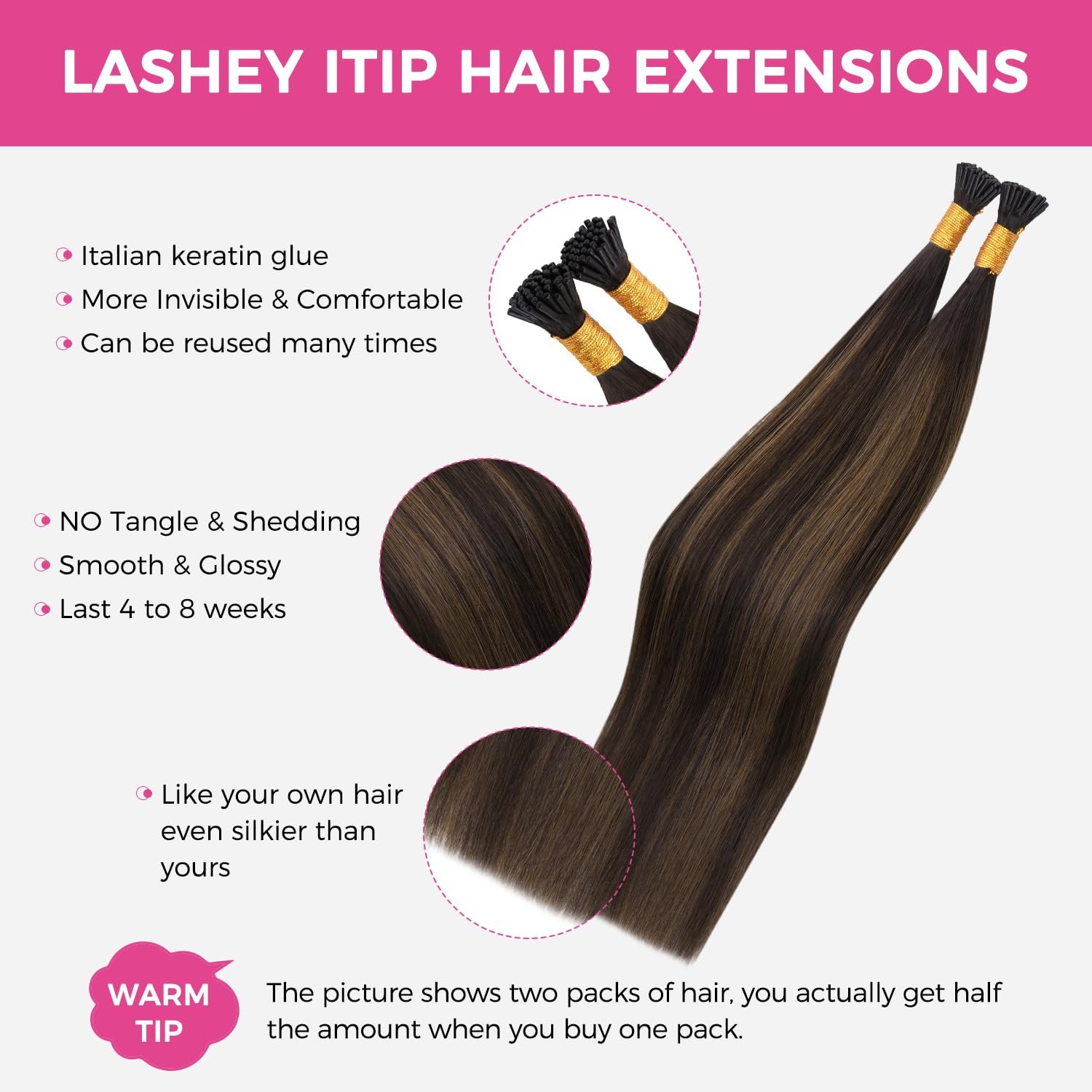 For optimal results, we recommend reinforcing I tip hair extensions every 2 to 3 weeks to prevent hair loss and maintain a secure fit. To achieve a full head of volume, it’s best to use 3 to 4 packs. When measuring the length, be sure to stretch hair fully before measuring from the roots to the tips for the most accurate result.
