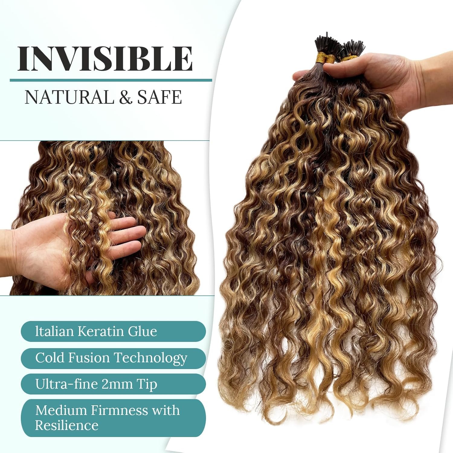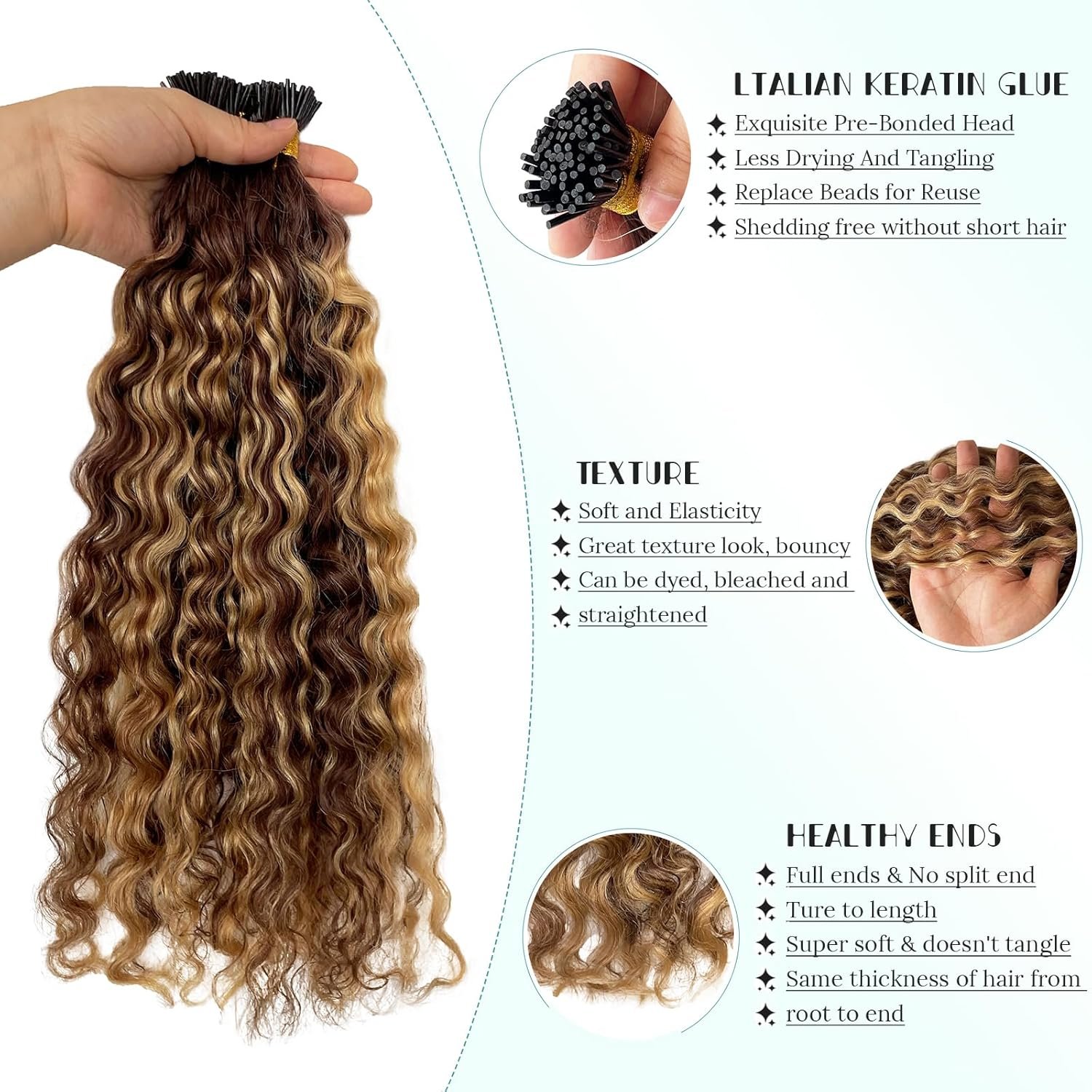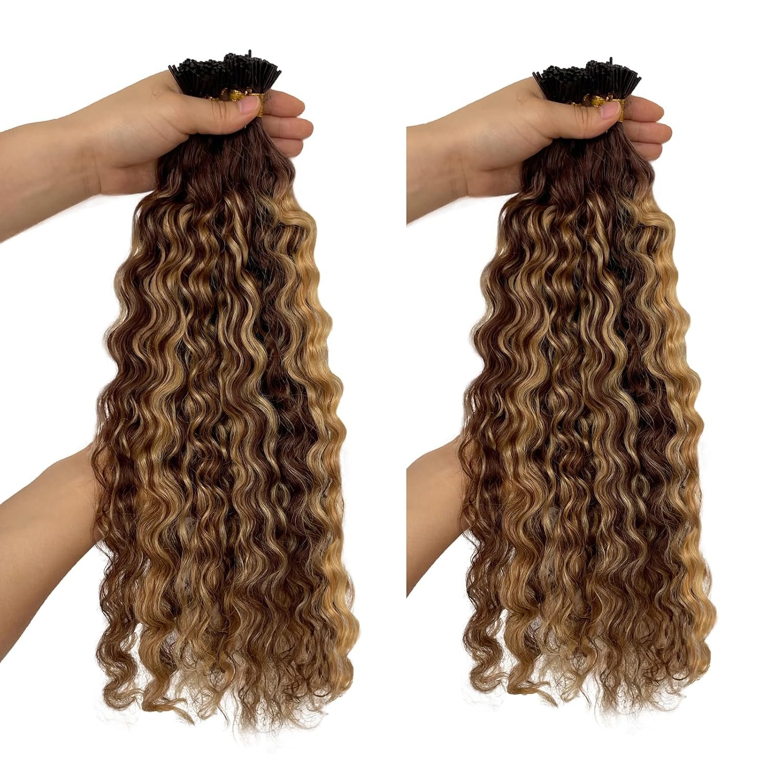 Cold Fusion Keratin I Tips Extensions Human Hair Specifications: Chocolate Brown Highlighted Honey Blonde Water Wave Stick Tipped Hair Extensions【14”-20” 100 strand,50g; 22″-28” 50 strands, 50g】The i-Tip Size Is 1cm Long×0.2 Cm Diameter (About 0.05cm Deviation). If You Choose The Cold Fusion Installation Method, Please Use Beads With a Diameter Of 0.4-0.5cm.