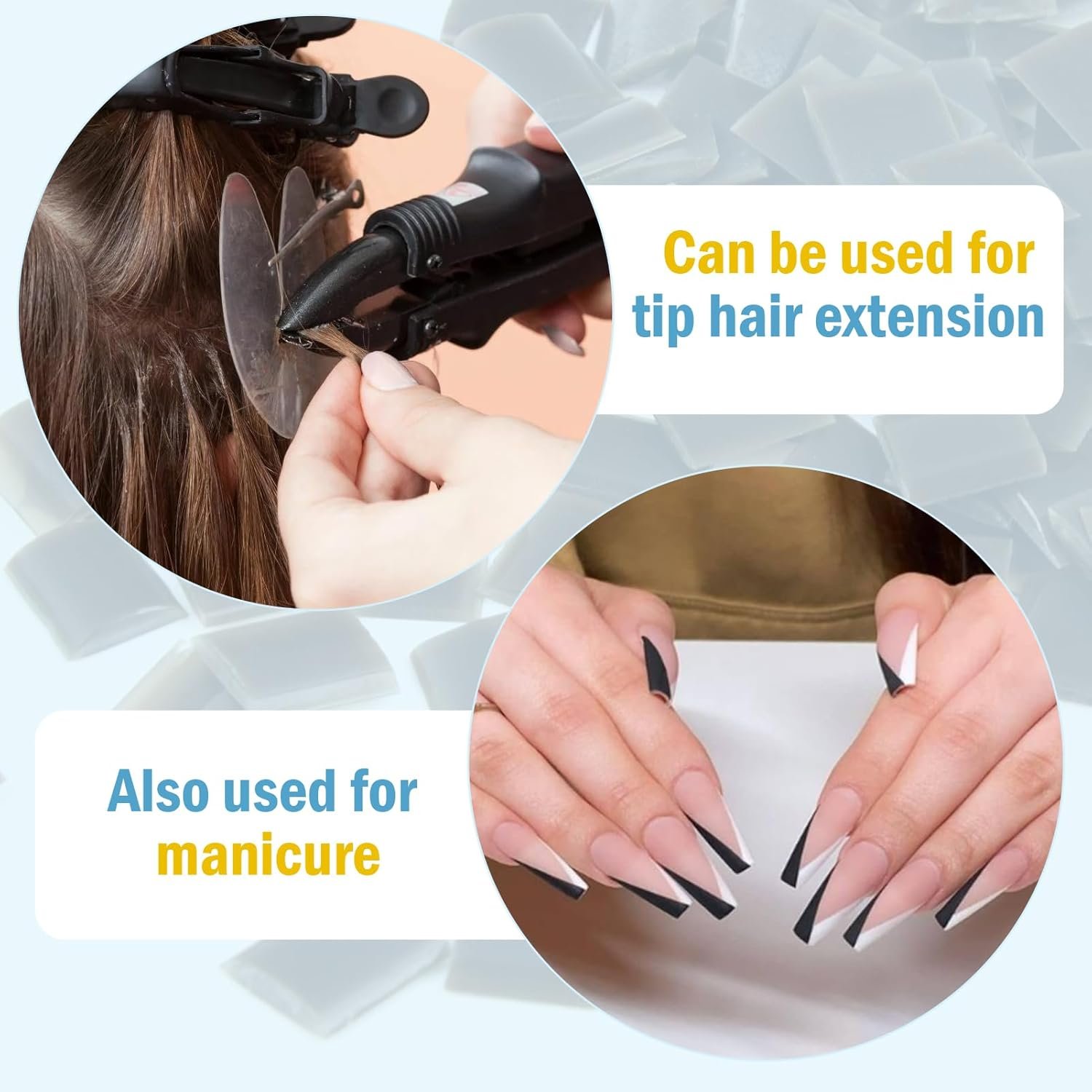 【MULTI-PURPOSE】Our keratin glue tips are very suitable to bond heat-sensitive materials. Due to it, these keratin glue granule pellet is not only for hair extensions and nail art, but also for decorating manuals,cartons, accessories, toys, shoes, wood products, ceramics.