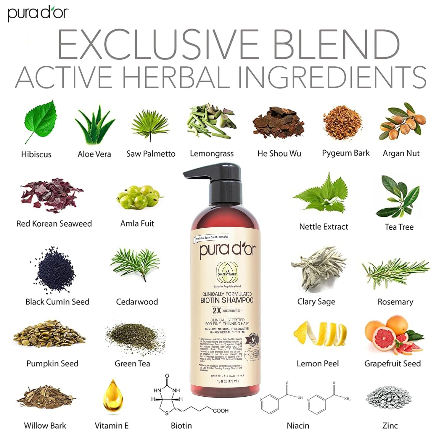 PURA D’OR Clinically Formulated double concentrated shampoo and conditioner for thinning hair is clinically tested to strengthen hair, and minimize breakage. It is one of PURA D’OR’s best selling shampoo and conditioner sets because of its double-strength feature that increases volume and thickness of your hair, keeping it moisturized and tangle-free all day long. Our clinically formulated shampoo and conditioner contains 17 key active ingredients in the shampoo and plant-based preservative system, each with twice the concentration to support and ensure a moisturized and healthier hair from roots to tips without any signs of distress, breakage, or leaving it flat. Saw Palmetto, Nettle extracts, Biotin, He Shou Wu, Red Korean Seaweed, Pygeum Bark Extract, and other exotic herbs to promote healthier, thicker-looking hair are part of the proprietary blend. Even with the double concentration formula, our sulfate-free shampoo and conditioner is still safe for our daily routine use on any hair types including natural hair, colored treated or dry and damaged hair, for both men and women. It is free from harsh chemicals and paraben-free. It is hypoallergenic, vegan, environmentally responsible, and cruelty-free.