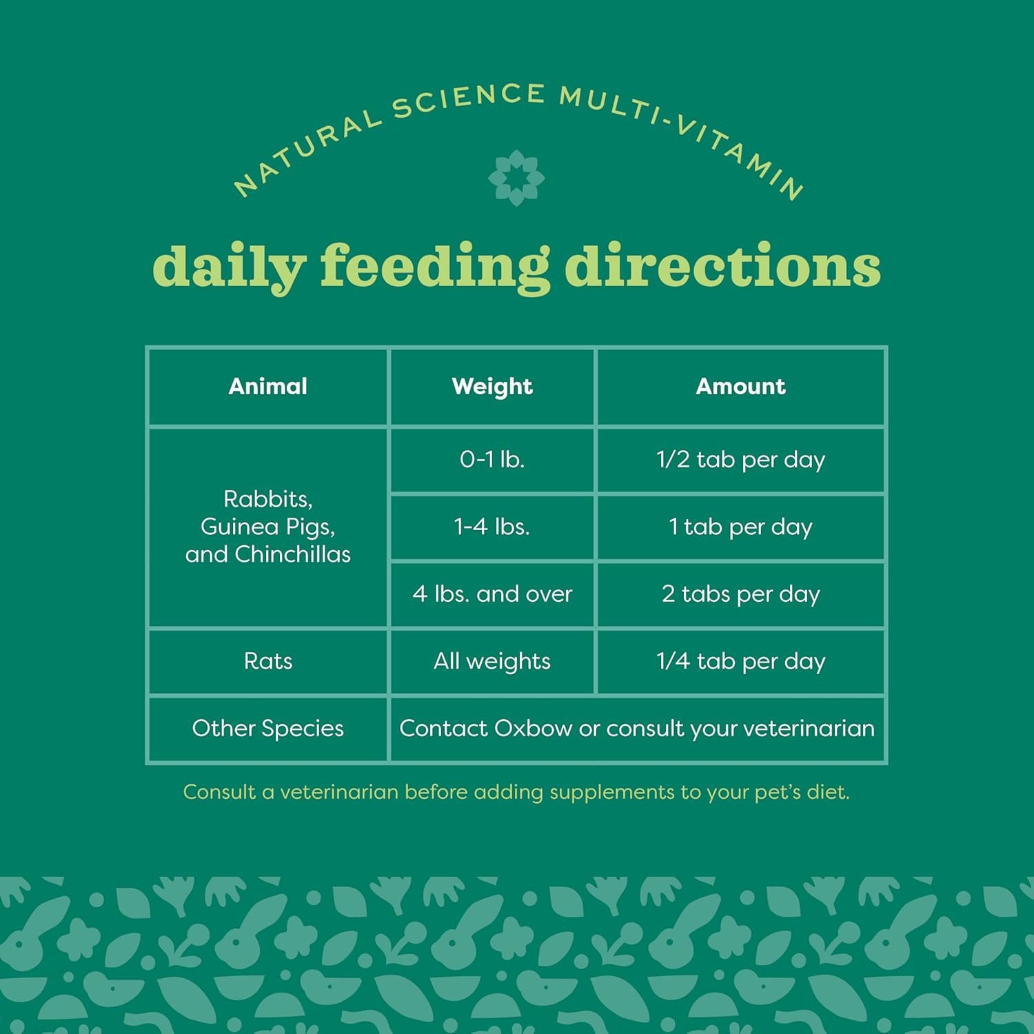EASY DAILY DOSE BY WEIGHT – Natural Science small animal supplements feature a simple feeding plan based on species: ½–2 tabs for rabbits, guinea pigs, chinchillas; ¼ tab for rats; 1/8 tab for hamsters/gerbils—making daily supplementation effortless.