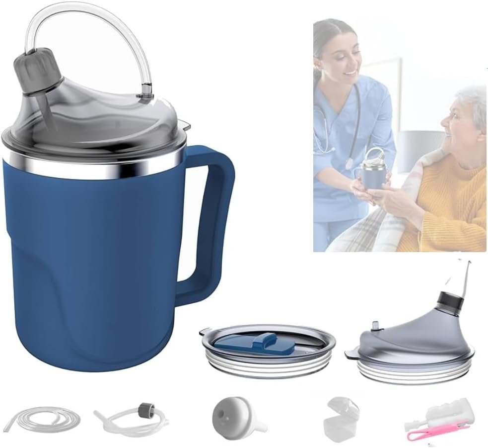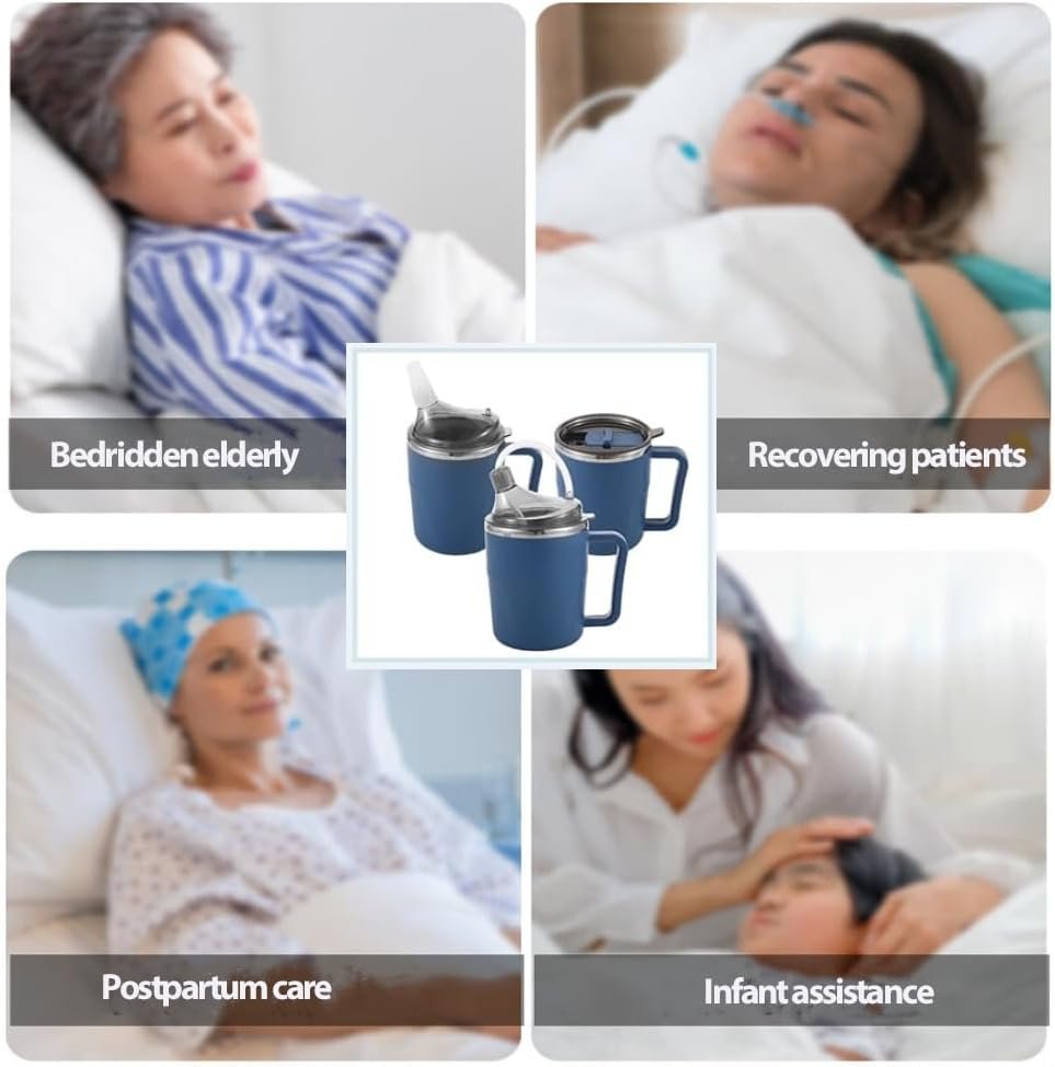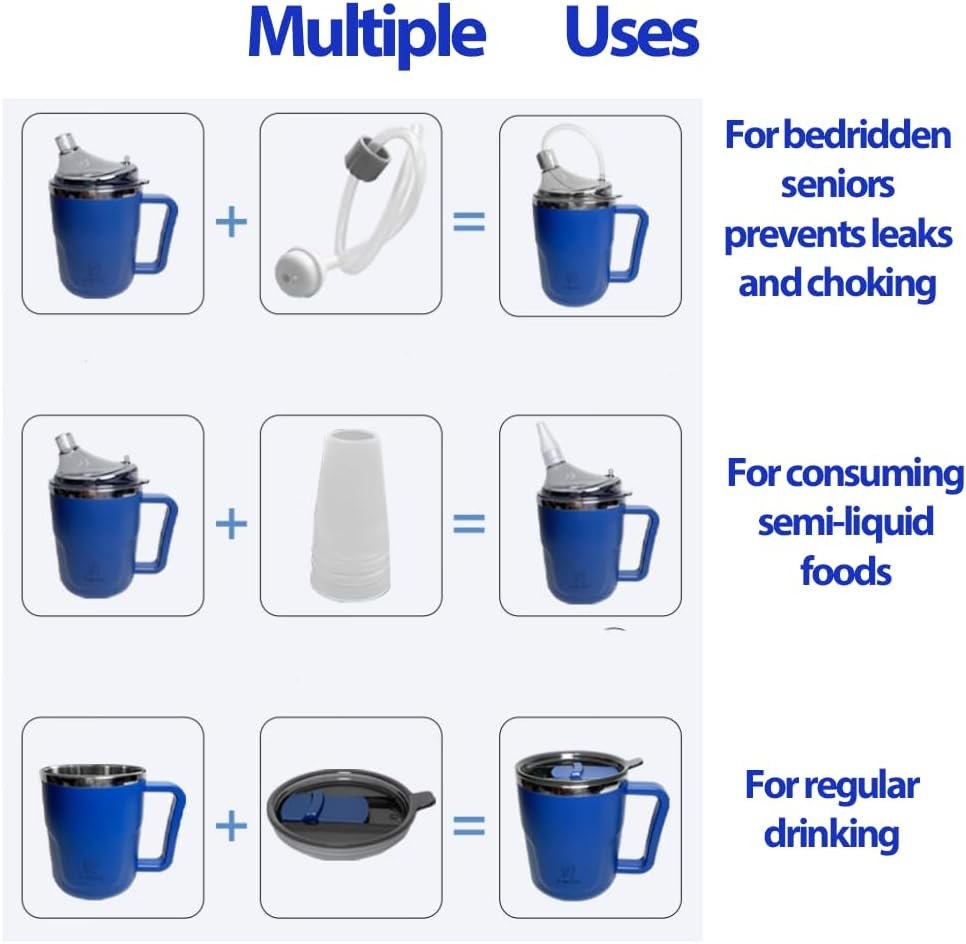 【Versatile Usage】The spill proof cup with a flexible straw and has 2 interchangeable lids, which is not only perfect for elderly drinking porridge, water, or soup while lying down, but also offer effortless hydration with this stainless steel sippy cup while seated or reclining.
