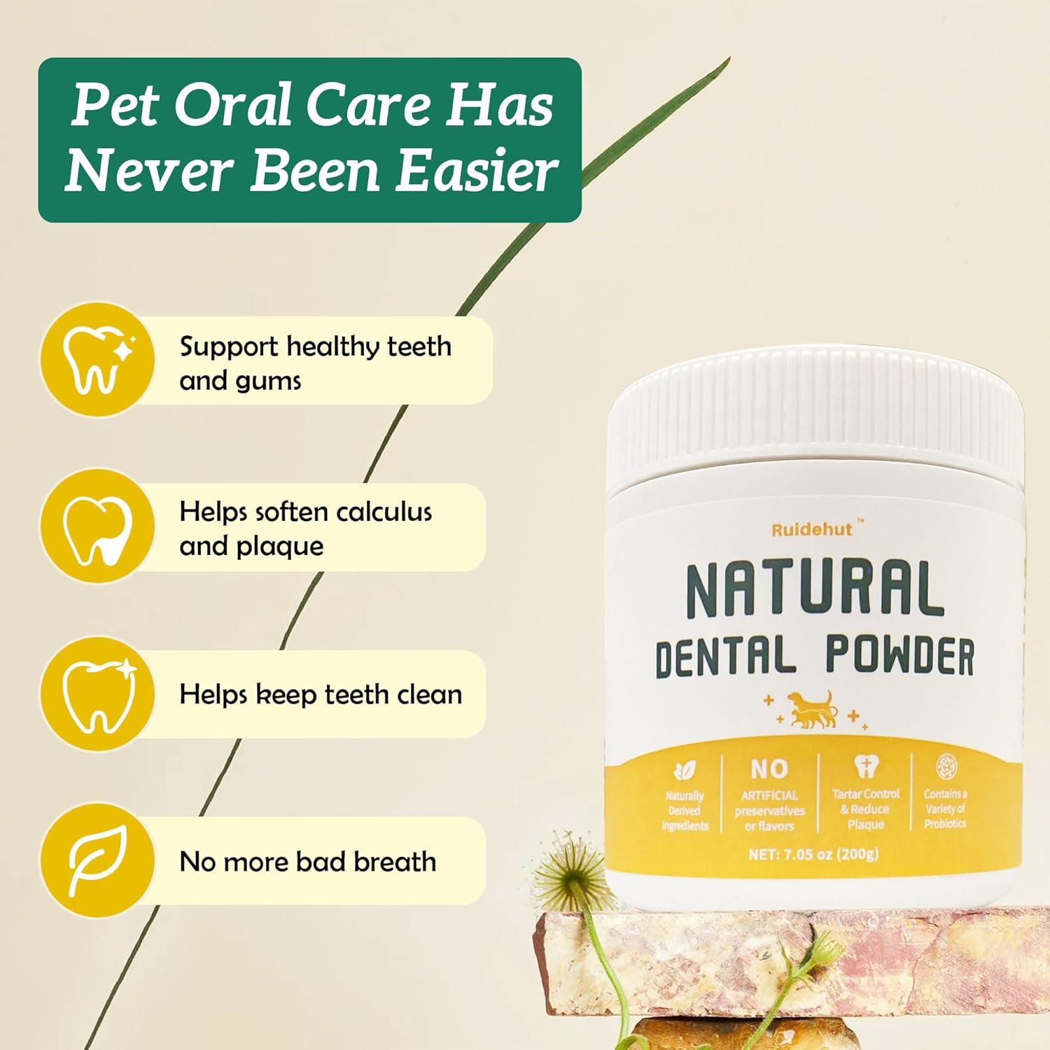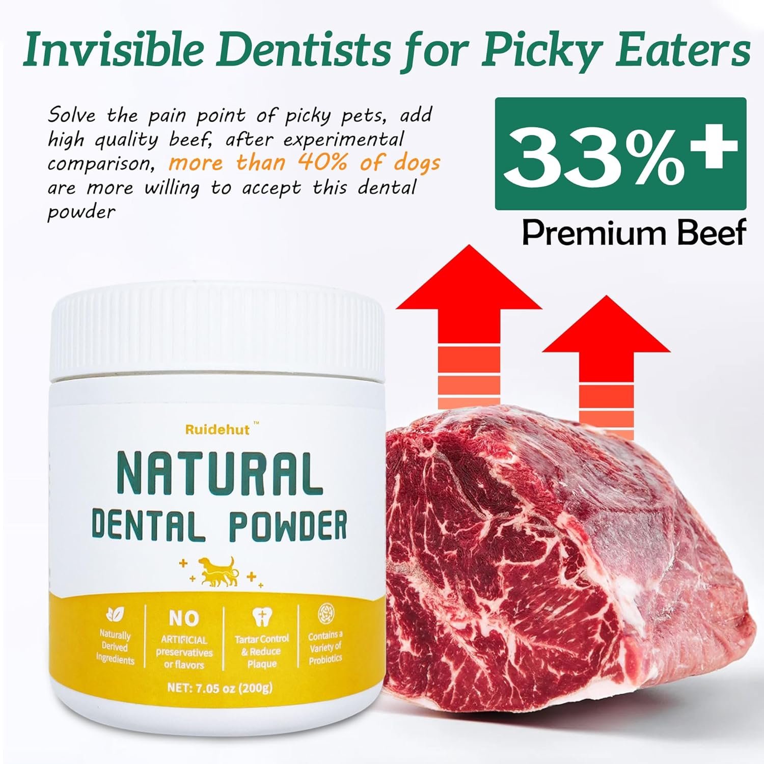 EASY DENTAL CARE: Our dog dental powder is a delicious beef flavor designed for pets, just sprinkle it on your dog’s food and mix. It’s easy to maintain your dog’s oral health without brushing, saving you time and money.